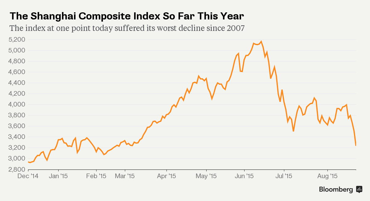 Китайские акции падали в максимальном темпе с 2007 года из-за провалившихся попыток правительства развеять опасения инвесторов в углублении спада во второй экономике мира. Индекс Shanghai Composite обвалился на 8.5% до 3,209.91 на закрытии. Индекс Hang Seng China Enterprises потерял 6.5% к 15:08 в Гонконге, что стало крупнейшим снижением с 2011 года. Фьючерсы на индекс CSI 300 упали на 10%.