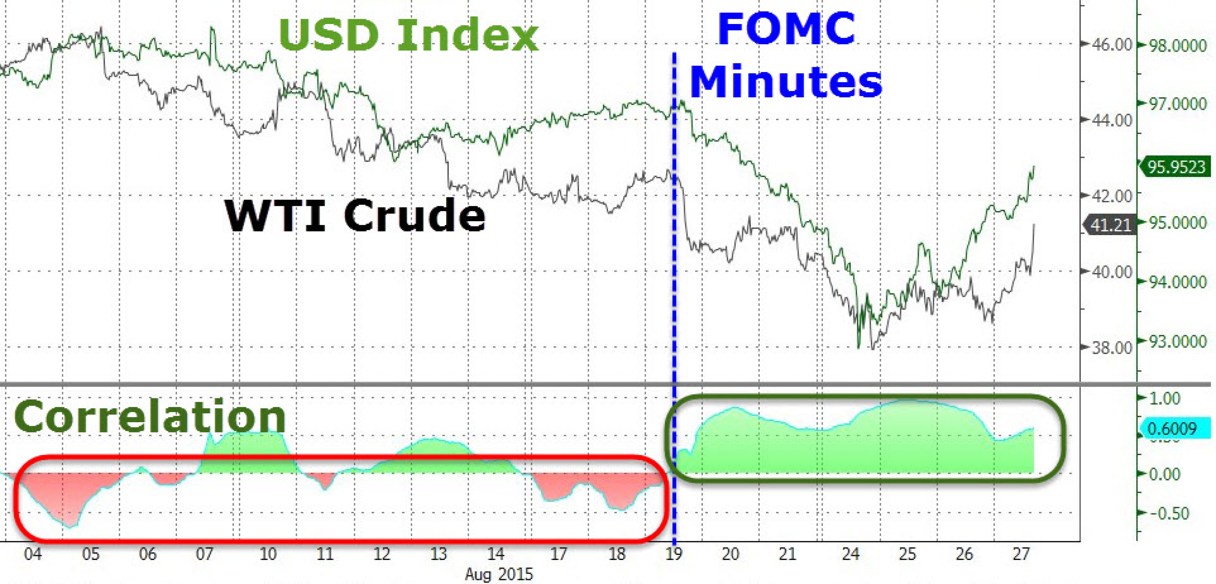 Кстати, мы уже отмечали этот факт, ведь в тот момент, когда "черное золото" переживало острую фазу снижения, не менее бурно дешевел и доллар. Раскорреляция проявилась как раз после публикации протокола последнего заседания Федрезерва.