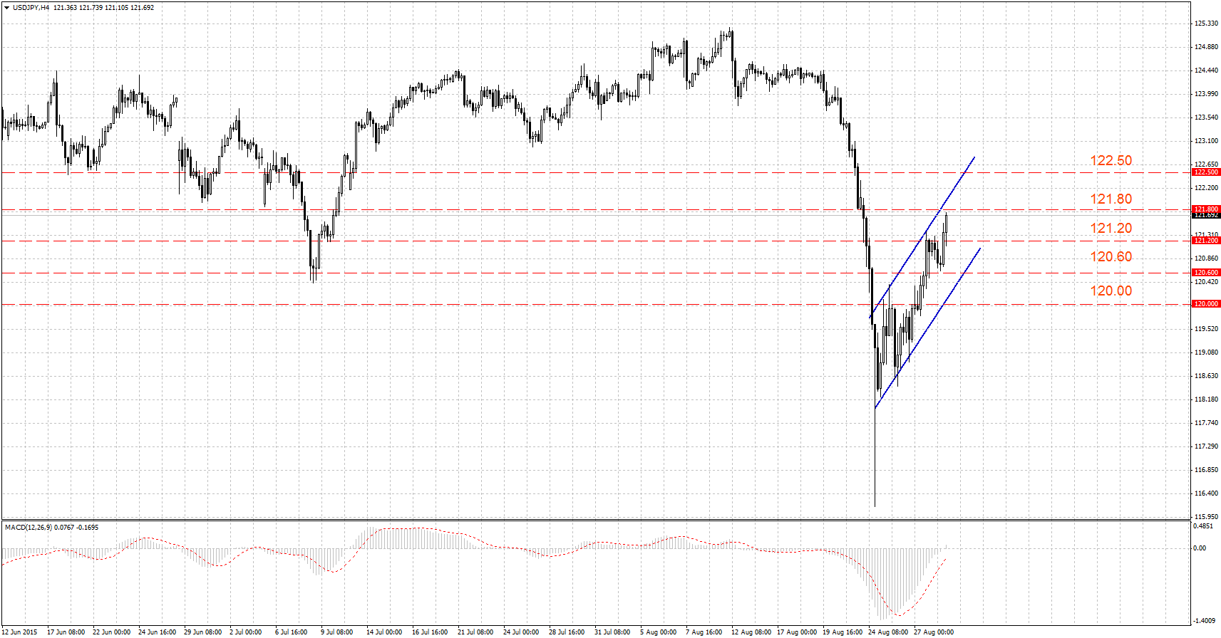Пара вышла их восходящего канала, упав ниже него. Сейчас USD/JPY пытается в него вернуться. Значимые уровни Фибоначчи для коррекции 61.8 (121.64), 50.0 (120.60).