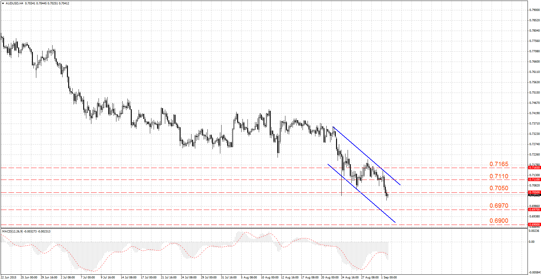Валютный инструмент AUD/USD развивает нисходящее движение и, вероятно, эта тенденция получит продолжение. Пара пробила поддержку 0.7050 и укрепилась чуть ниже. Далее поддержка расположена на 0.6970.