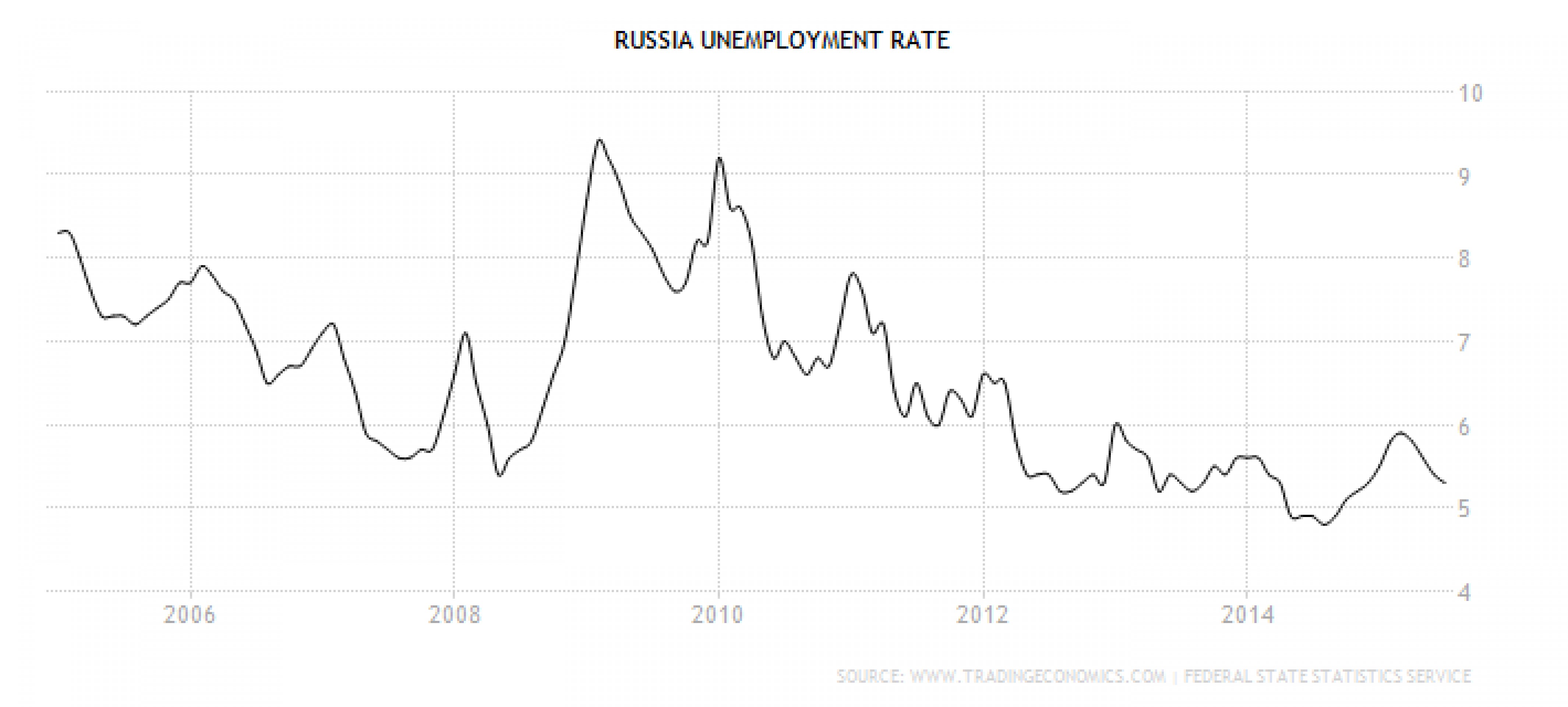 При все при этом мы наблюдаем крайне любопытную ситуацию: безработица в России, несмотря на кризис, находится вблизи минимумов за последние 10 лет. Такая динамика может говорить лишь о неэффективности бизнеса и о слабой производительности труда.