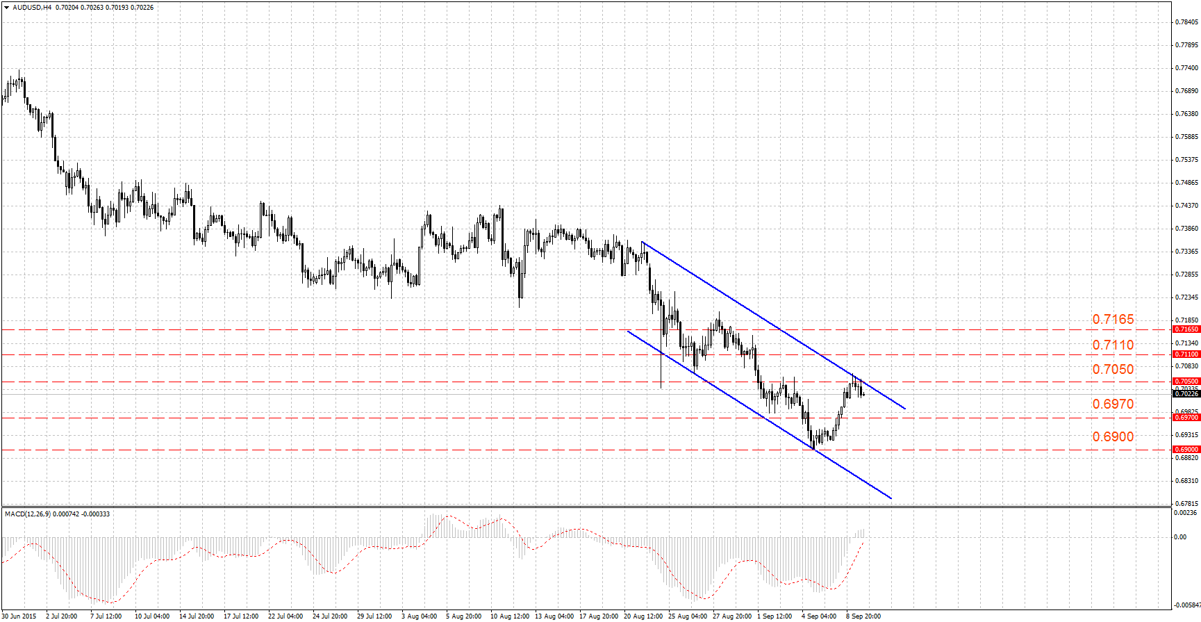 Валютный инструмент AUD/USD проявляет склонность к росту. Оттолкнувшись от поддержки 0.6970, котировки выросли и протестировали сопротивление в области 0.7050. Быкам не хватило потенциальной силы пробить указанный уровень, и цена развернулась вниз.