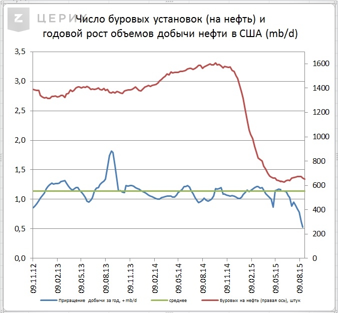 Добыча с запозданием, но все более уверенно стала реагировать на обвал буровых, произошедший в начале 2015 года. За пару месяцев снижение добычи составило 0,47 млн. баррелей. А годовой прирост добычи на 4 сентября ушел ниже средних цифр за последние годы (+1,14 mb/d) почти в половину этого уровня (до +0,652 mb/d). Но, напомним, что пока это только реакция добычи на происходившее год назад обвальное снижение цен. Должно еще пройти время, чтобы увидеть реакцию динамики добычи и на летнее снижение цены.