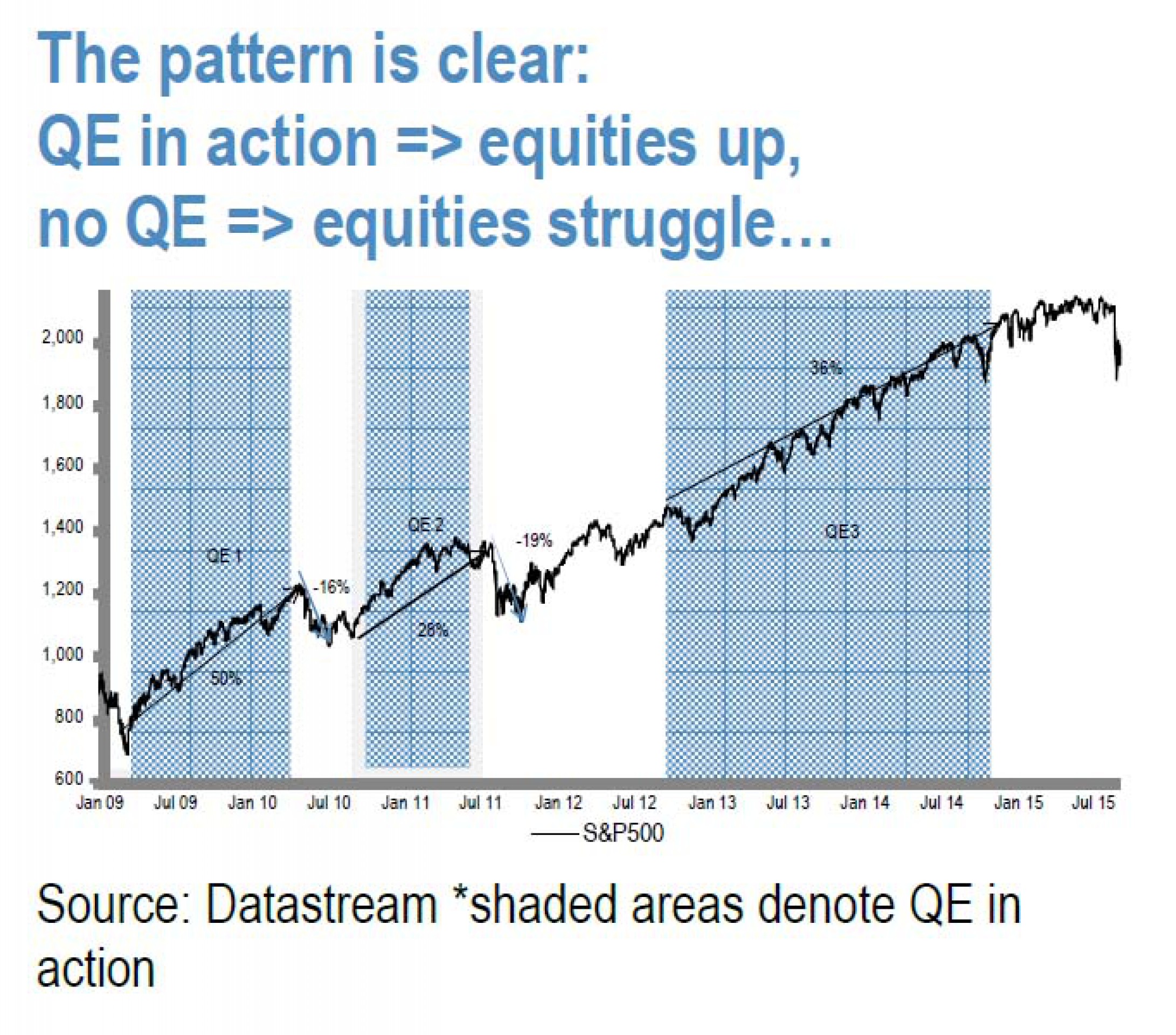 Что касается фондовых рынков, то здесь взаимосвязь очень и очень простая: пока есть QE, рынки растут, когда QE нет - рынки падают.