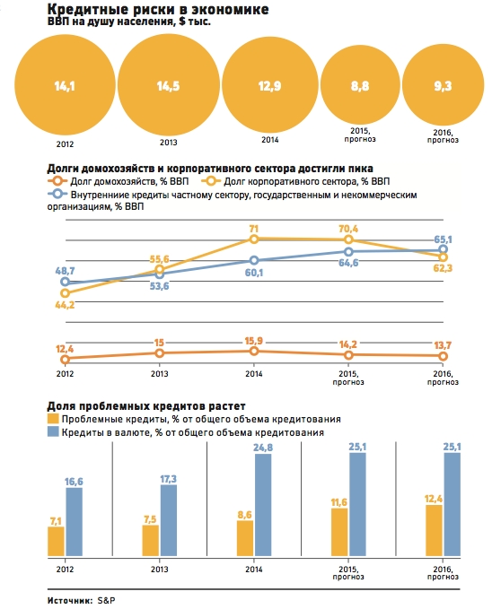 «Скорее всего, кредитование в реальном выражении, действительно, будет сокращаться в течение ближайших двух лет», — соглашается аналитик Райффайзенбанка Денис Порывай. Поддержки можно ждать только со стороны ключевых заемщиков в лице экспортеров — падение цен на их товары компенсируется девальвацией рубля, отмечает он. Ситуация в банковском секторе — даже хуже описанной SnP, полагает заместитель гендиректора Интерфакс-ЦЭА Алексей Буздалин. «В отчетности банков уровень корпоративной просрочки сильно занижен, и реально он сейчас составляет около 20%», — оценивает он. «Качество текущих заемщиков будет ухудшаться, и параллельно банки будут подтормаживать выдачу новых кредитов, что в итоге может привести к резкому скачку роста просрочки», — считает эксперт.