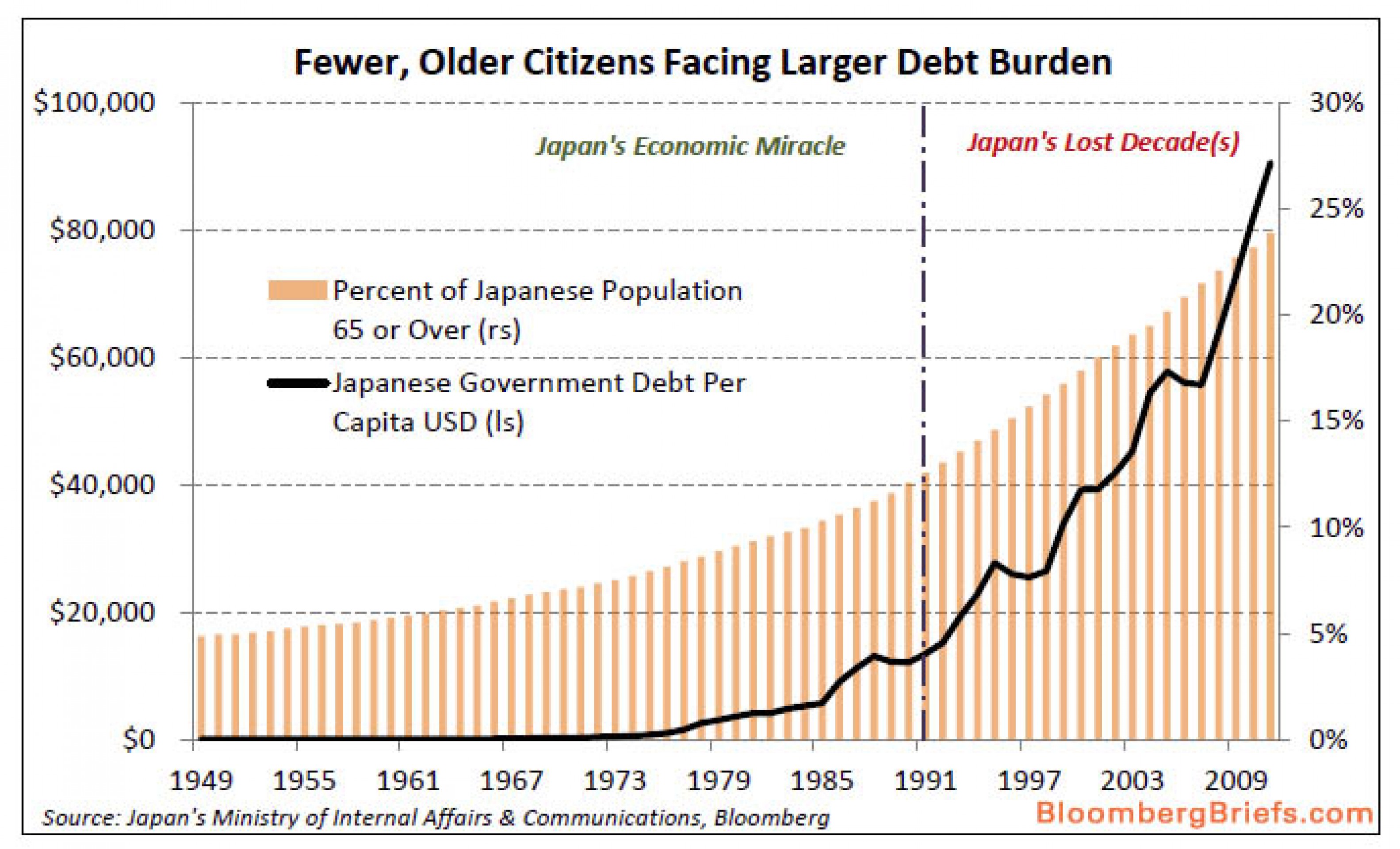 Возвращаясь к Японии, отметим, что меньшее количество людей и меньшее количество работников снизит потенциал японской экономики, что заставит ее еще больше зависеть от импорта, поскольку пенсионеры будут продолжать тратить. Тем временем, по мере роста количества пенсионеров, будет расти нагрузка на социальные программы и пенсионные фонды, которые были крупнейшими покупателями госдолга Японии, и это при том, что Япония является второй по объему госдолга страной в мире.
