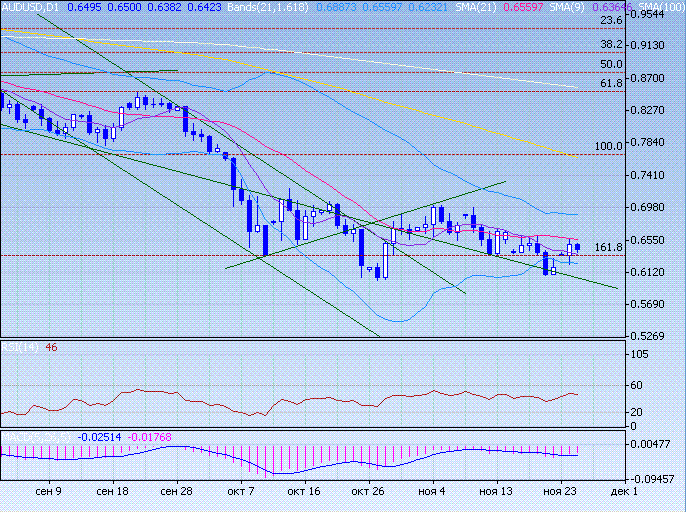 Пара удерживается по 0,6330 в середине полосы Боллинжера. Снижения к минимумам в район 0,6080 не произошло, что указывает на потенциал аусси к росту. Закрепление выше 0,6330 приведет к росту аусси в район 0,6560.
