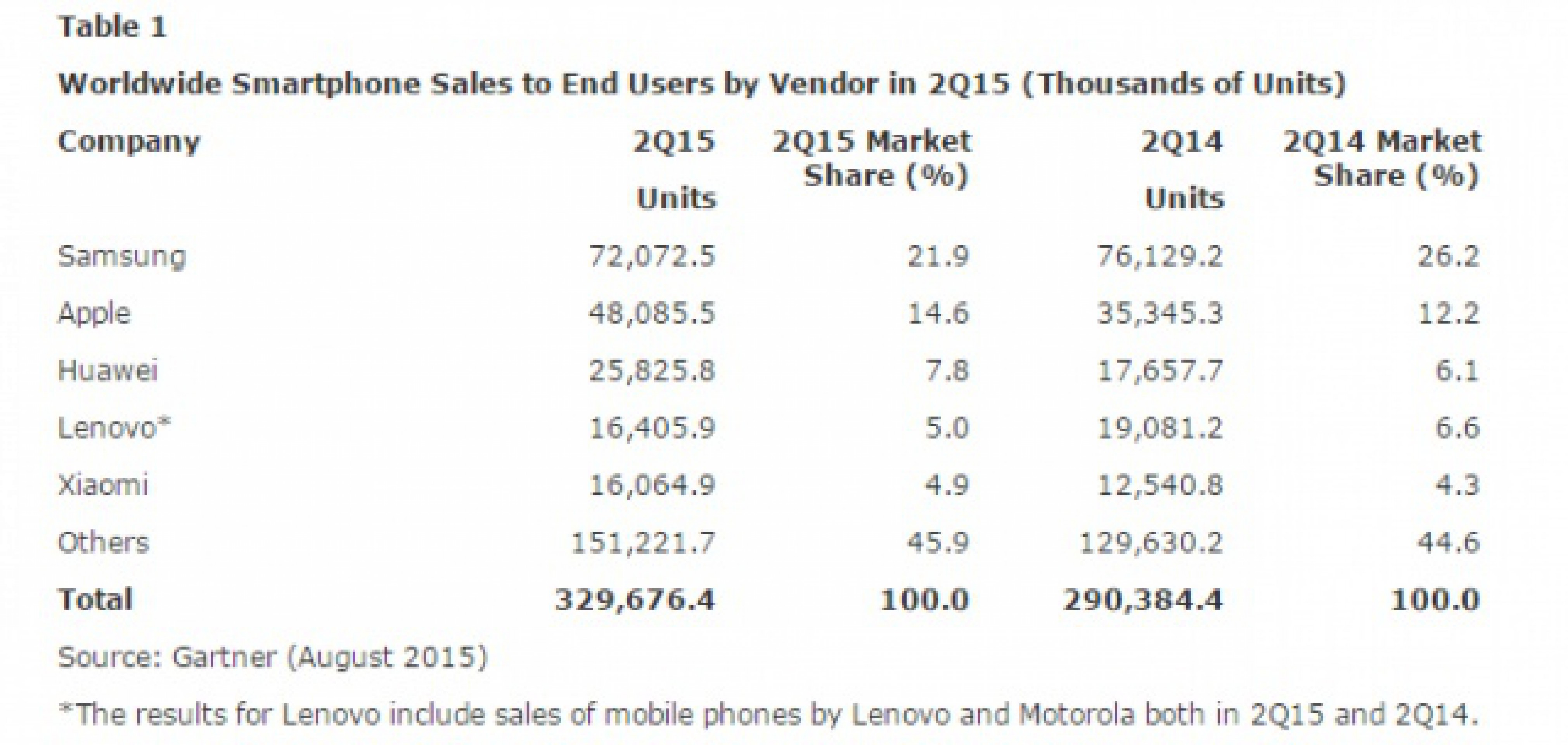 В апреле-июне 2015 г. доля Samsung на глобальном рынке смартфонов сократилась более чем на 3 процентных пункта из-за растущих продаж iPhone и сильной конкуренции со стороны китайских брендов, таких как Xiaomi. Кроме того, компания ошиблась с прогнозом по реализации Galaxy S6: модель Galaxy S6 Edge с закругленным дисплеем оказалась весьма востребованной, однако производитель не выпустил ее в достаточном количестве и создал дефицит, в то время как обычную версию флагмана затмил iPhone 6.