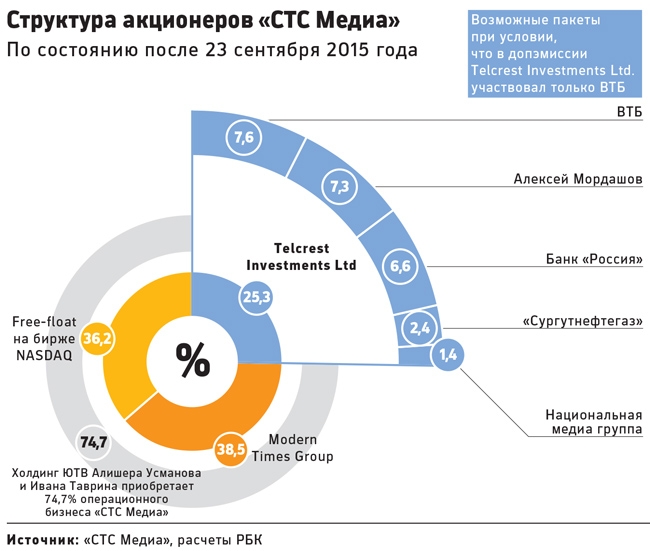 Сейчас Мордашову в Telcrest может принадлежать около 29%, знает один из собеседников РБК (соответственно, ему косвенно принадлежит около 7,3% всей «СТС Медиа»). Если допэмиссию выкупил единственный участник — ВТБ, то по ее итогам доля банка в кипрской компании могла составить 30,1%. Косвенная доля ВТБ во всей «СТС Медиа» теперь составляет 7,6% (рыночная стоимость этого пакета накануне допэмиссии, 22 сентября, составила $22,3 млн). На вопрос РБК о том, участвовали ли оставшиеся акционеры Telcrest — «Сургутнефтегаз» и Национальная медиа группа — в допэмиссии, представители этих компаний не ответили.