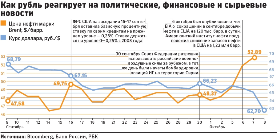 Рубль укрепляется благодаря росту цен на нефть, указывает аналитик «Уралсиб Кэпитал» Ирина Лебедева. С начала октября баррель нефти марки Brent подорожал больше чем на 10%. Только за вторник, 6 октября, цена выросла на 5,42% и впервые с конца августа превысила отметку в $50 за баррель. В среду нефть подорожала еще на 1,2%, до $53,2.