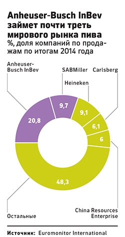 В случае, если сделка будет закрыта, объединенная группа будет производить более трети всего пива в мире: по данным Euromonitor International, совокупная доля компаний по итогам 2014 года составляла 30,7% (см. инфографику).