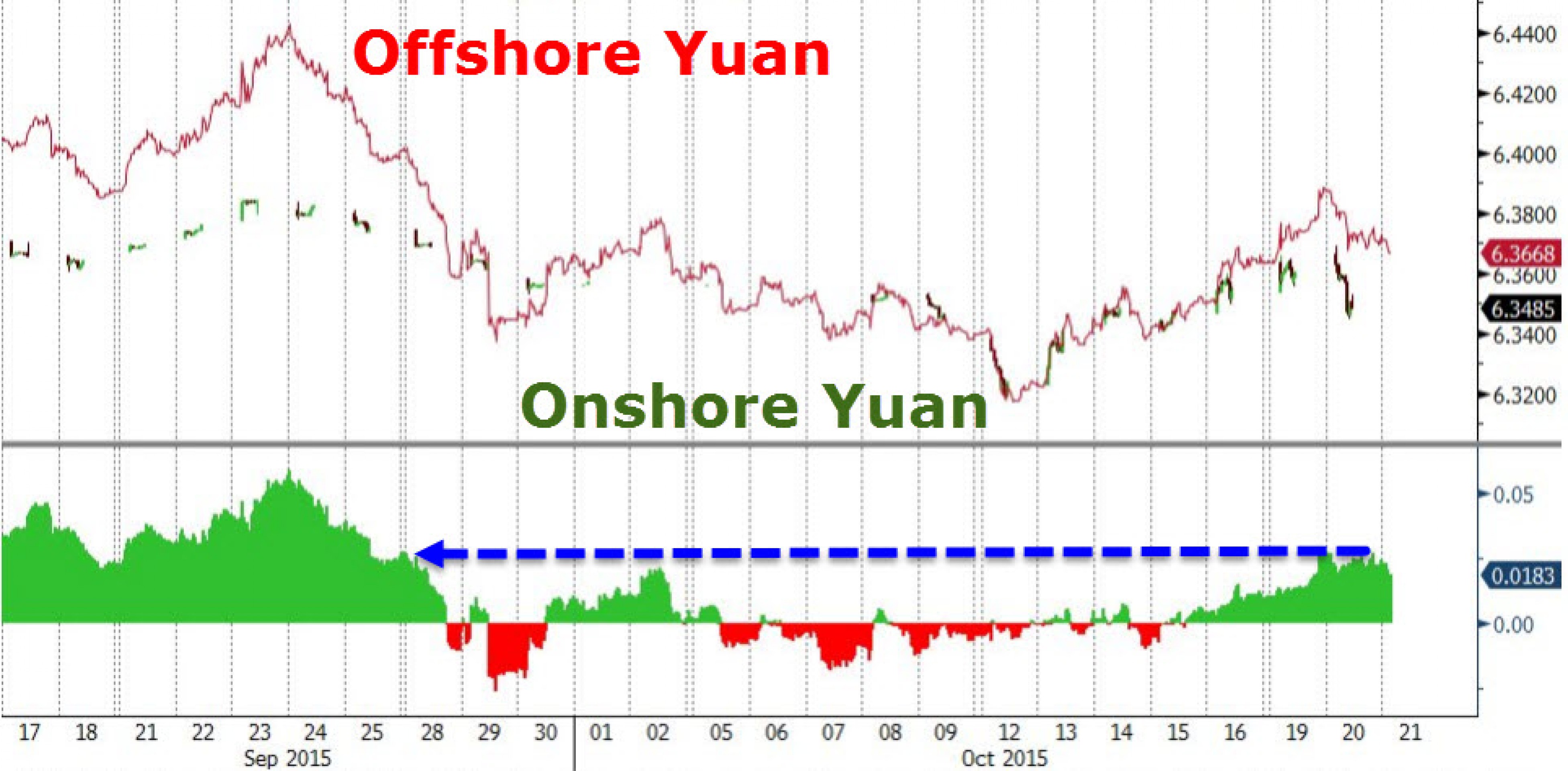 После нескольких недель стабильности, на валютном рынке Китая снова началось движение. Спред между курсом юаня на внутреннем и внешнем рынках достиг максимума за месяц.