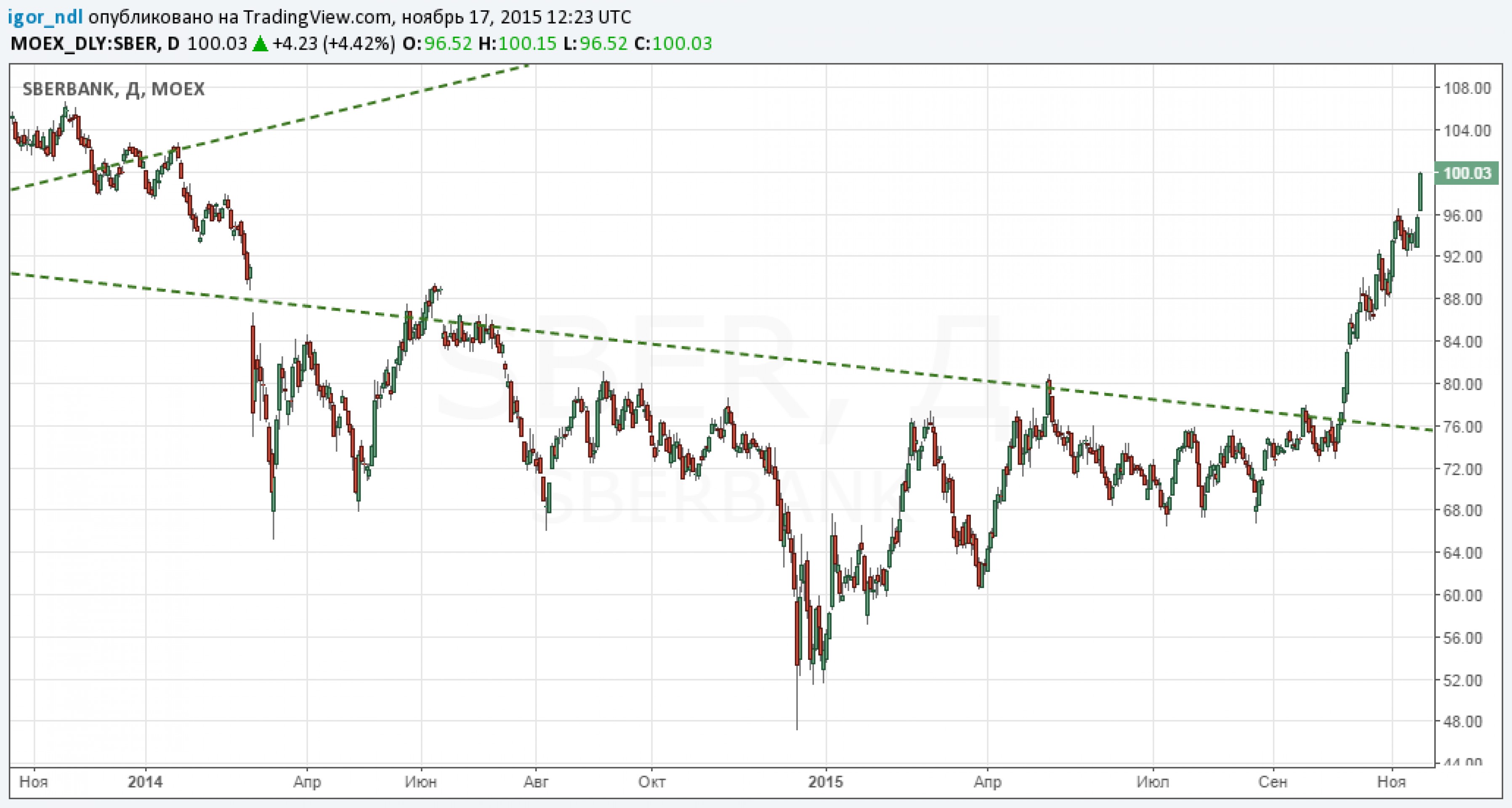 Кстати, стоит отметить рост котировок акций Сбербанка. Исторически сложилось, что именно эти бумаги являются опережающим индикатором хорошего или же плохого будущего для российской экономики. Сегодня цена акций крупнейшего российского банка превысила отметку 100 руб.