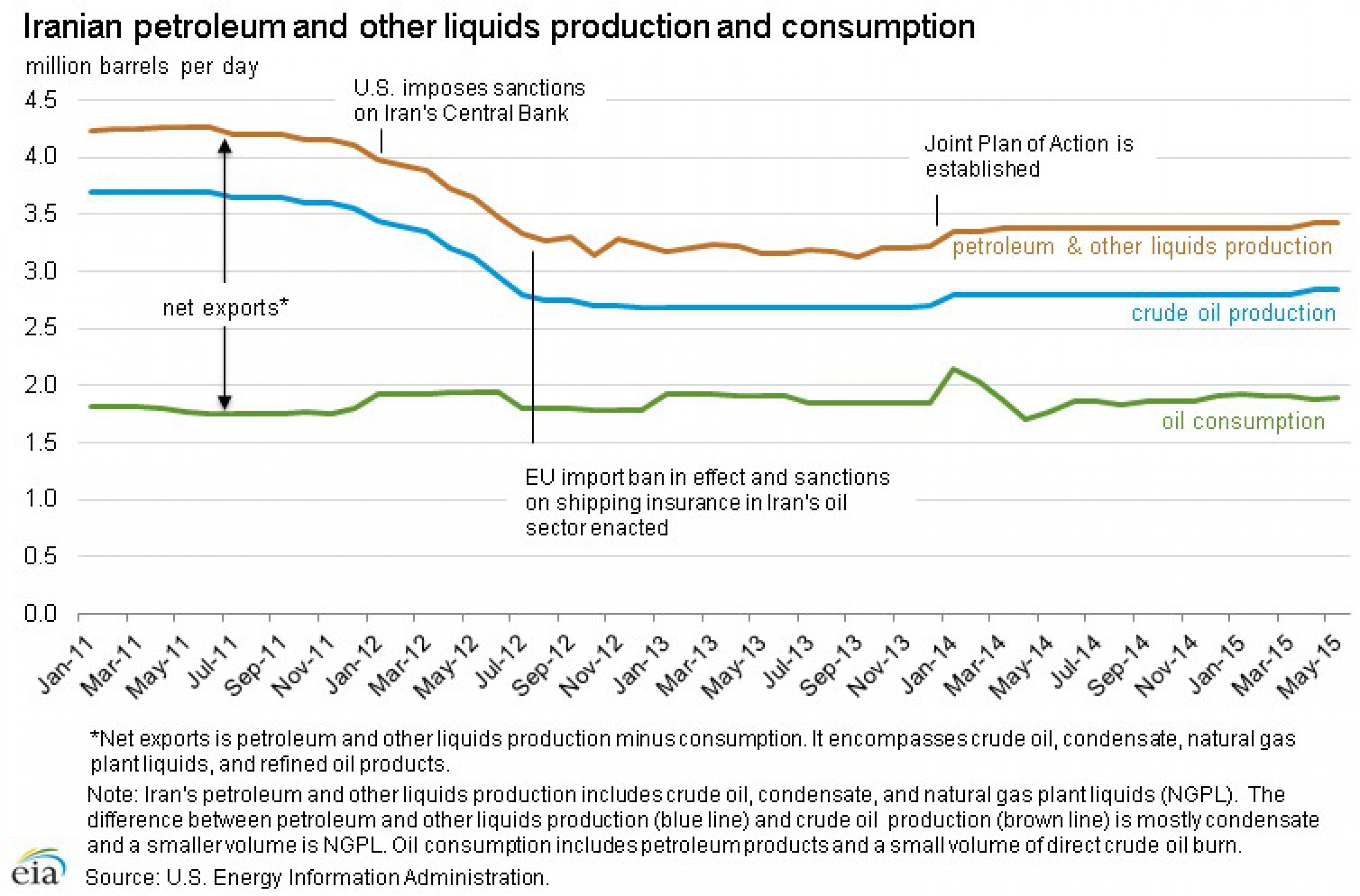 Из-за экономических санкций экспорт Ирана упала до всего 1 млн баррелей в сутки в июле 2012 г., так как сильно пострадали поставки в Китай, Индию, Южную Корею и Японию.