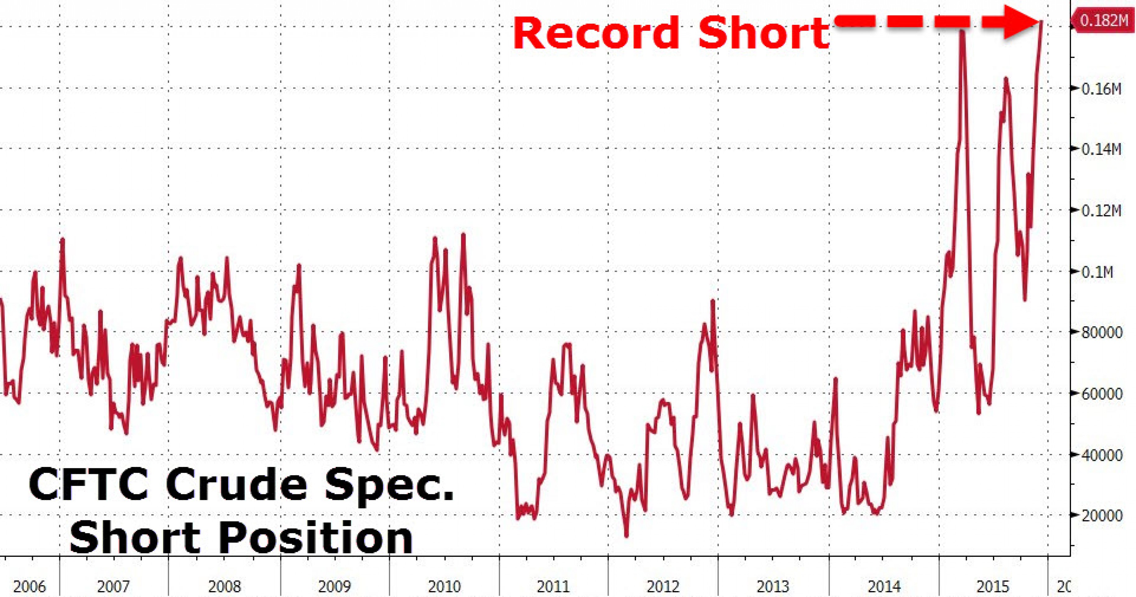 Очевидно, что нефтяной крах - дело рук спекулянтов, которые стремятся заработать на негативном информационном фоне, хотя, возможно, нисходящий тренд нефти является какой-то геополитической задачей. Так или иначе, мы видим, что количество коротких спекулятивных позиций в нефтяных фьючерсах достигло рекорда.