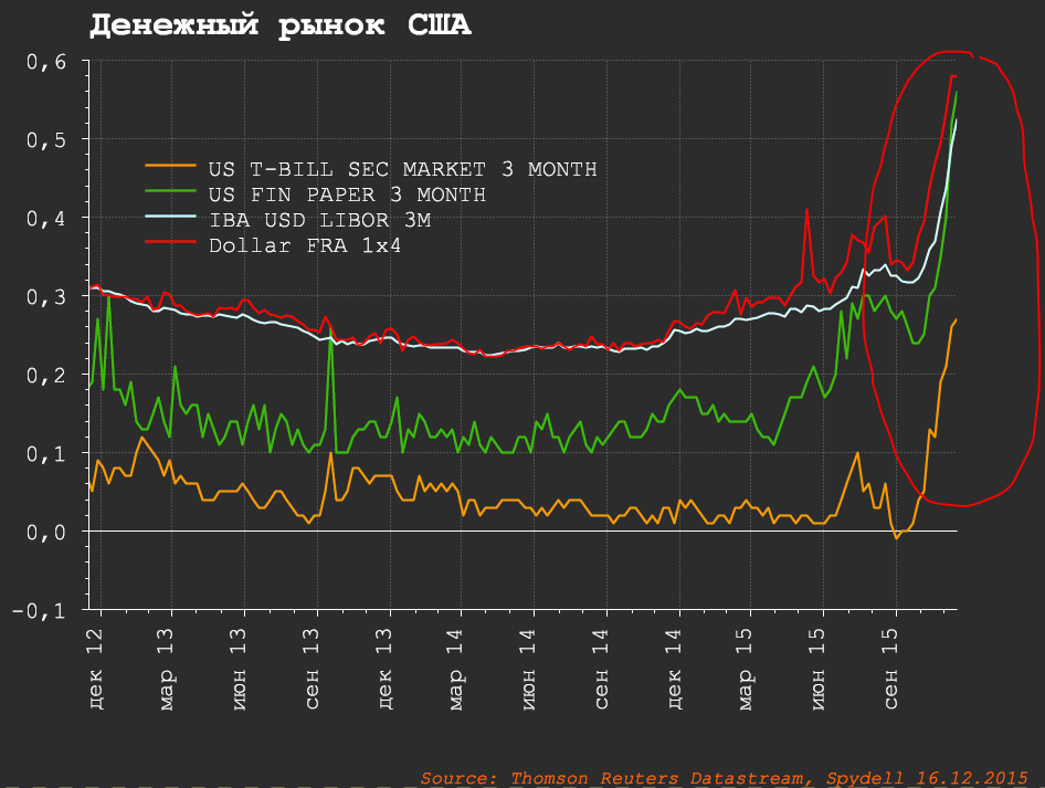 Трехмесячные форвардные контракты на процентную ставку (Dollar FRA 1x4) пошли в рост с 20 чисел октября 2015. За 3 месяца до фактического повышения ставки. Dollar FRA 1x4 – это трехмесячный (4-1) форвардный контракт на ставки по денежному рынку с отсрочкой в один месяц.