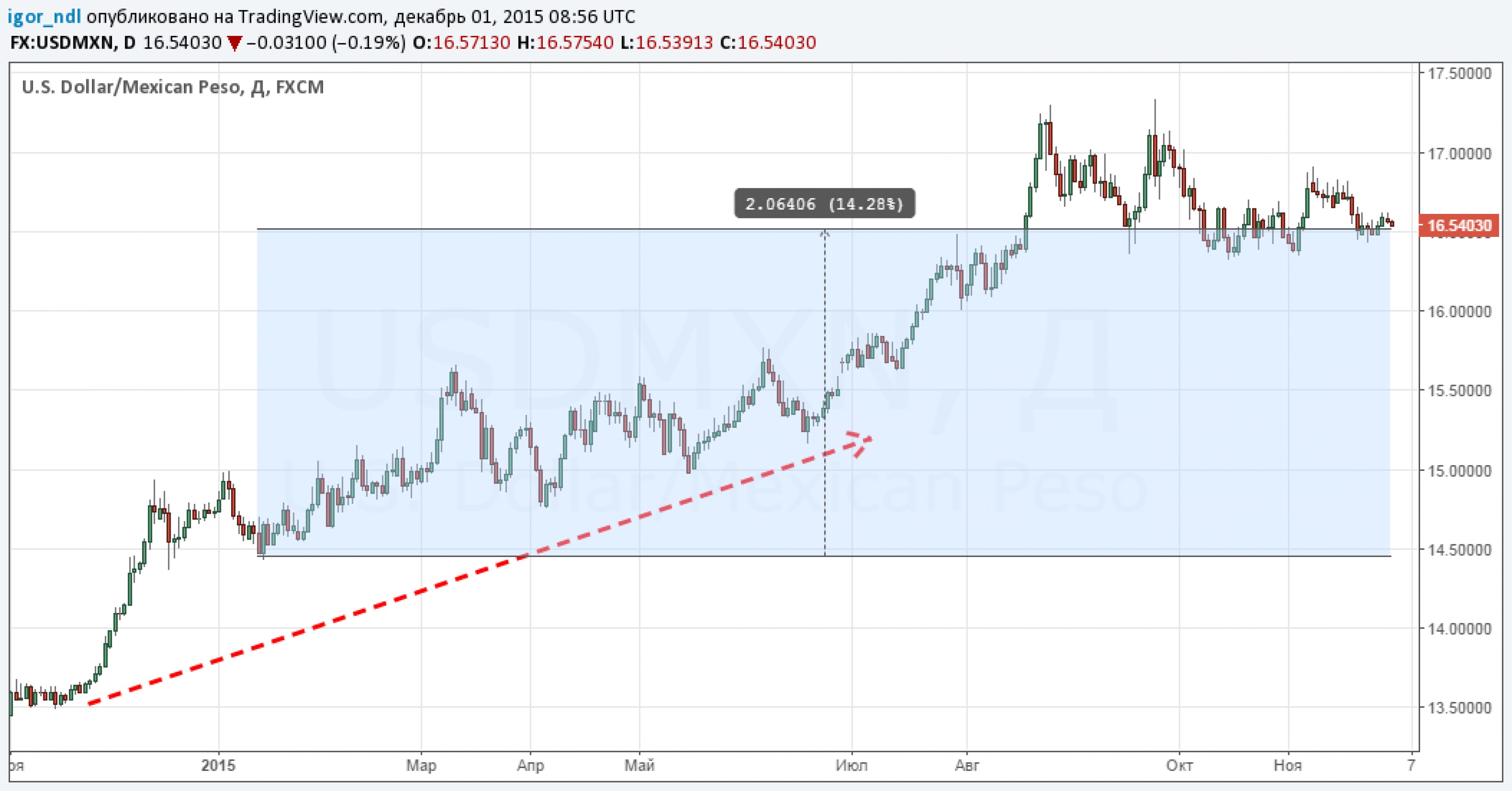 Нефтяной фактор давит и на курс мексиканского песо. И хотя в определенной мере падение курса связано и с ожиданиями повышения ставки ФРС, падение нефти здесь играет куда большую роль.