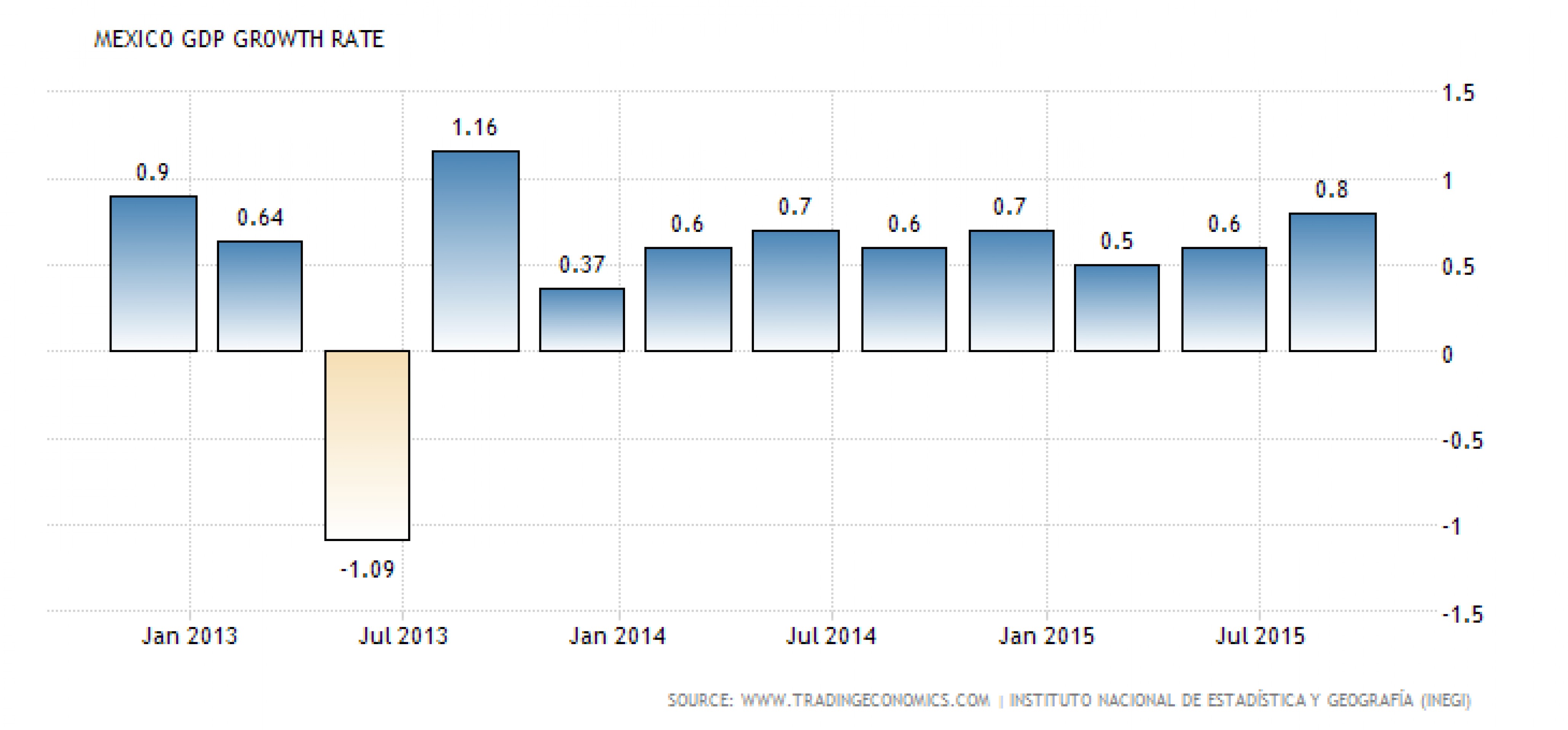 Судя по всему, именно благодаря реформам экономика Мексики показывает хотя и не выдающийся, но рост. Позитивная динамика сохраняется, и, по последним данным, рост ВВП составил 0,8%.