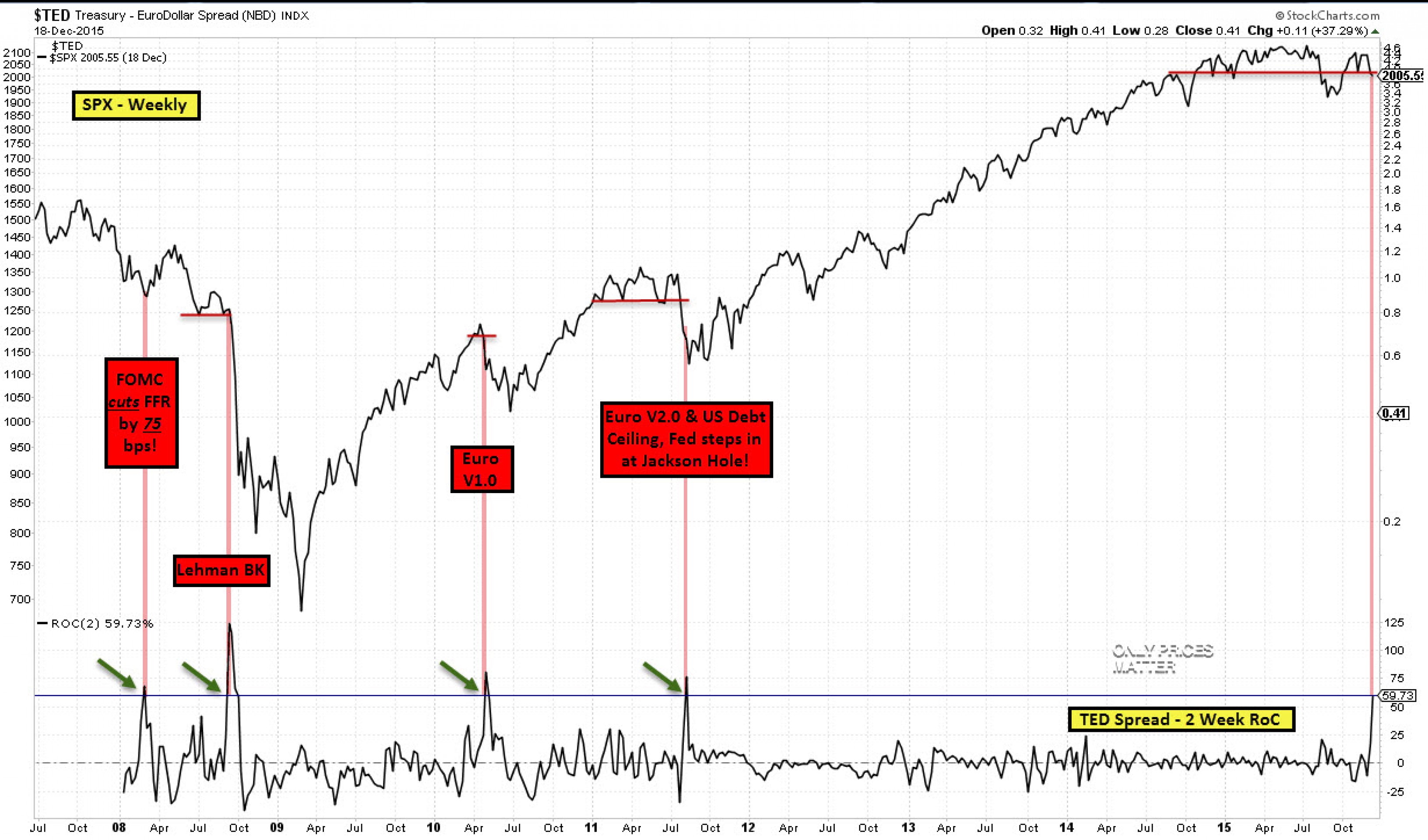 Исходя из динамики рисков возникает вопрос, а вовремя ли ФРС повысила ставку? Кстати, с точки зрения фондовых рынков скорость, с которой растет TED-spread, выглядит откровенно пугающей. Достаточно взглянуть на исторический график индекса SnP 500 и TED-spread.