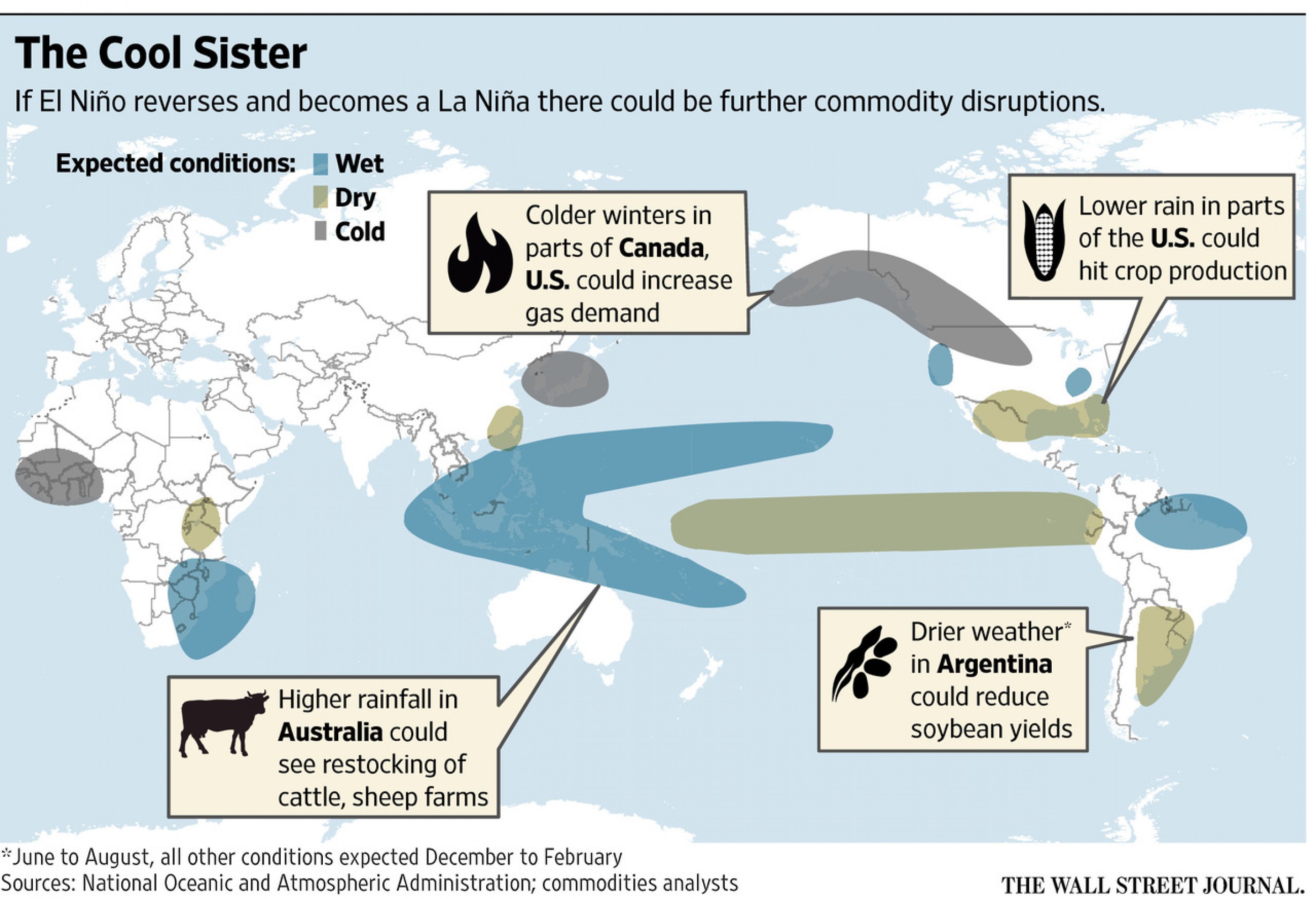 Якобы эффект от El Niño - колебаний температуры поверхностного слоя воды в экваториальной части Тихого океана, имеющих заметное влияние на климат в сторону потепления, - сходит на нет, и на смену ему приходит La Niña - полная противоположность. La Niña, как сообщается, может привести к резкому похолоданию и, как следствие, стать поводом для хаоса на рынке сырья. Но все это пока вопрос будущего.