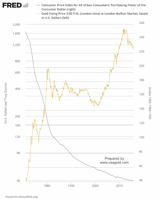 За 1700 лет, как можно видеть на графике выше, изменилось немногое. С 1971 года, когда Соединённые Штаты отвязали доллар от золота, открыв эру бумажных денег, доллар потерял 83% своей покупательной способности. Доллар 1971 года сейчас стоит 17 центов. Золото тем временем выросло с $35 за унцию до уровня $1,100 на сегодняшний день (с остановкой на уровне $1900 за унцию в 2011 году). За долгий период, как и во времена Древнего Рима, в современную эпоху золото сохранило свою покупательную способность, в то время как доллар, как и динар, постепенно обесценивался. Вот почему 4,000 римских монет из клада, найденного недавно в швейцарском саду, косвенно подтверждают значимость владения золотом сегодня.