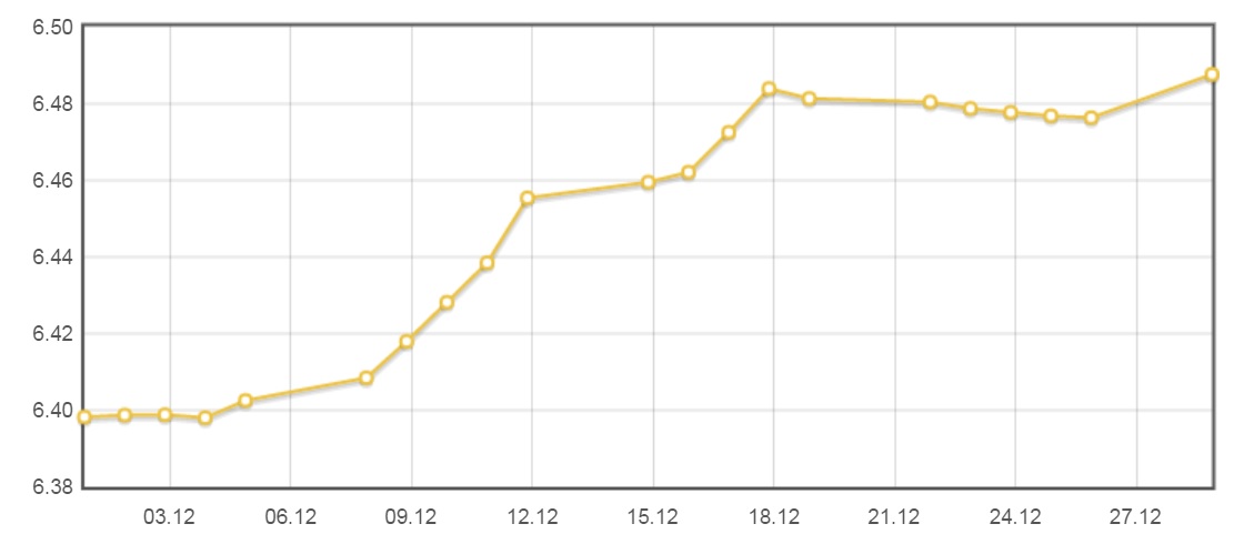 Китайская валюта продолжила слабеть по отношению к доллару. К 30 декабря за один доллар давали 6,4875 китайских юаней. Тенденция к дальнейшему ослаблению юаня вызывает вопросы, особенно в связи с недавними решениями МВФ. Напомним, что китайский юань включен в корзину резервных валют МВФ, куда до сих пор были включены только доллар США, евро, японская иена и британский фунт. Решение исполнительного совета МВФ о включение юаня в корзину валют вступит в силу 1 октября 2016 года. Таким решением МВФ запоздало реагирует на возросшую роль экономики Китая в мировой экономике. Изменение статуса юаня это важная веха в процессе интеграции китайской экономики в глобальную финансовую систему. В последние годы на мировых рынках возрастает роль финансовых инструментов, номинированных в юанях, и они завоевывают популярность во всем мире. Этот процесс будет прогнозируемо развиваться и далее. Так сейчас, Минфин России планирует выпуск облигаций, номинированных в юанях. Возможно, что происходящее в последнее время небольшое ослабление юаня к доллару предоставляют интересный шанс для долгносрочных вложений.