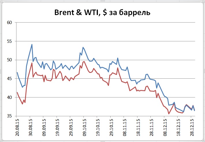Для нефти окончание года оказывается необычайно минорным. Для цен европейской нефти кроме ожиданий роста добычи в Иране и Ираке примешивается угроза поставок нефти из США, ожидаемая в связи со снятием эмбарго на экспортные поставки. Спреды между ценами нефти марок WTI и Brent остаются в последние дни вблизи нулевых отметок.