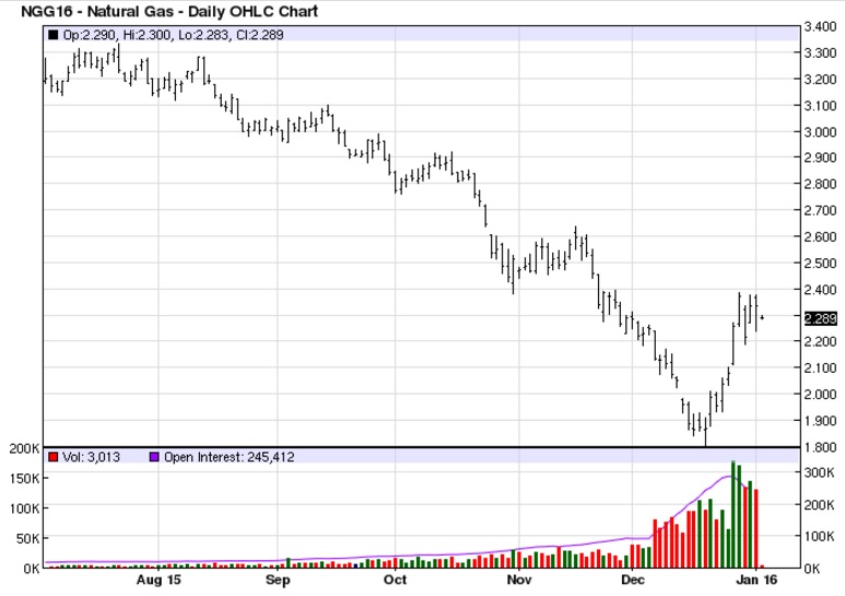Цены на газ в США за последнюю пару недель прошедшего года сильно выросли. (В пике рост составлял около 30%). Рынок боится, что господствующие в морских окрестностях повышенные температуры (плюсовая аномалия в Тихом океане достигает 3,5 градусов, а на Атлантическом побережье США доходит до 4%) могут скоро смениться отрицательным отклонением от среднегодовых уровней. А вот в Европе и России начало нового года было отмечено резким снижением температуры. Так что впереди нас ждут сообщения о росте потребления газа. А пока стало известно, что по итогам 2015 года добыча газа в нашей стране снизилась на 1% до 635 млрд. куб. м.