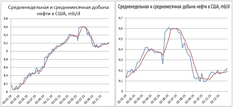 Согласно недельным оценкам среднедневные объемы добычи за неделю, закончившуюся 1 января, выросли на 17 тыс. бар. в сутки (до 9,219 с 9,202 mb/d неделей ранее). Это на 123 тыс. баррелей в сутки (+1,4%) выше, чем в минимуме полугодия от 16 октября и на 391 тыс. (-4,1%) баррелей в сутки меньше, чем в максимумах от 5 июня.