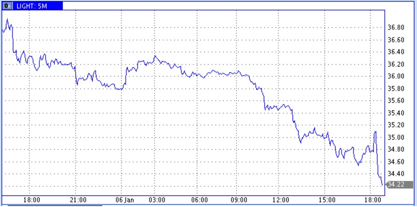 Цены на нефть в течение 6 января заметно снижались, опускаясь как по Brent, так и по WTI ниже 35 долларов за баррель. Как и ожидалось, начало года для нефтяных цен оказалось неблагоприятным. Перед выходом данных покупатели решили, что можно играть на опережение по запасам. Тем более, что запасы нефти за неделю действительно снизились. Однако реальность оказалась гораздо хуже – снижение запасов нефти было сильно перекрыто ростом запасов моторного топлива. Значит, НПЗ будут постепенно снижать нагрузку, дожидаясь возрастания спроса. А в это время запасы нефти вновь рискуют возобновить рост. Кроме того, вышедшие данные показали очередное подрастание объемов добычи. Как результат – после небольшого подрастания цены отправились за поиском новых минимумов.