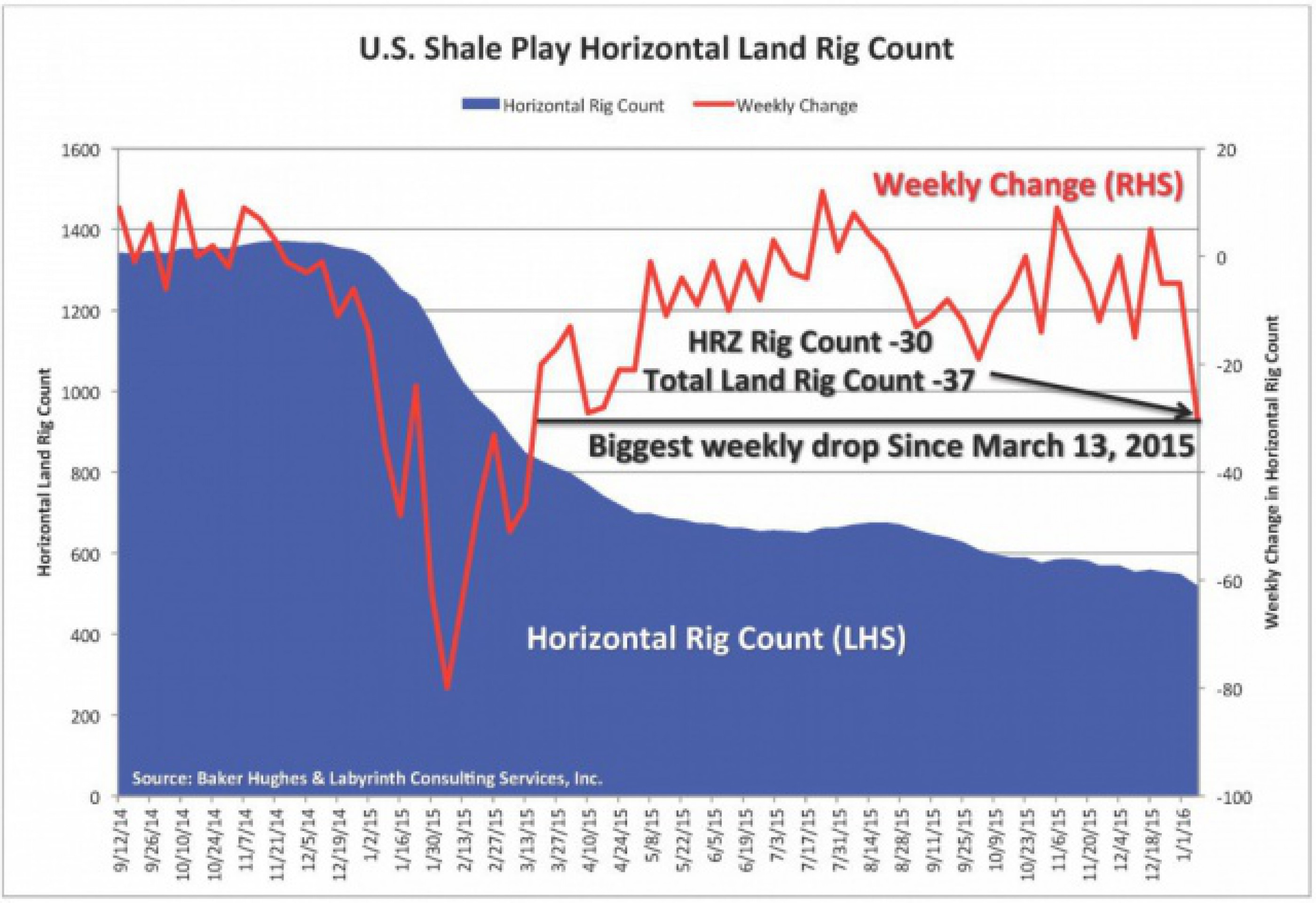 Первая полная неделя 2016 г. оказалась весьма неудачной для американской сланцевой промышленности. Количество работающих буровых установок продолжило падать, при этом падение было очень сильным.