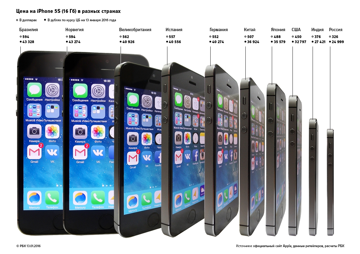Цена модели iPhone 5s в 25 тыс. руб., или $326 по курсу ЦБ на 13 января, — сейчас самая низкая в мире, рассказала РБК представитель re: Store Людмила Семушина. Например, как следует из информации на официальном сайте Apple, в Германии аналогичная модель смартфона стоит €505 ($552), в Бразилии — 2299 бразильских реалов ($594), в Испании — €509 ($557), в Великобритании — £379 ($562), в США — $450, добавила представитель re: Store.