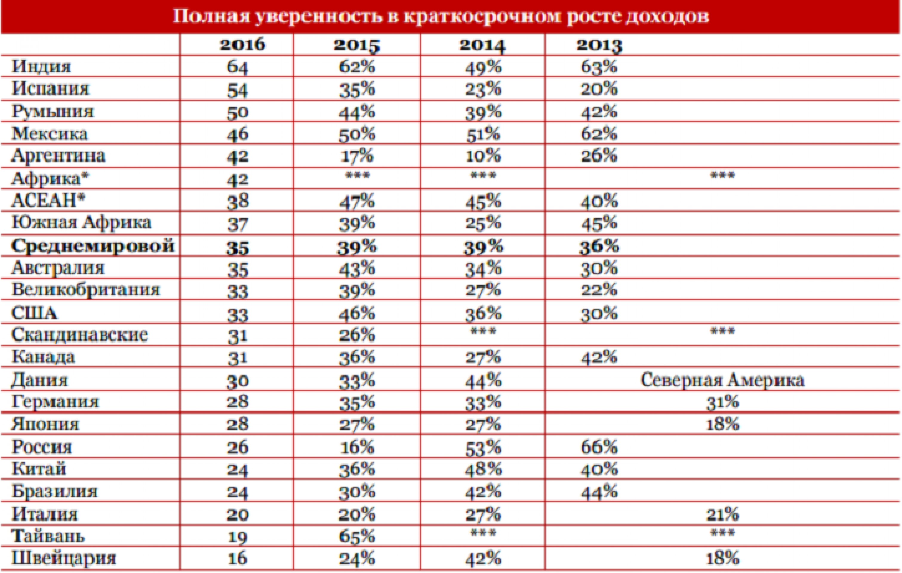 Уровень уверенности в увеличении доходов также снизился по сравнению с прошлым годом практически в каждой крупной экономике мира: в Китае он составил 24% (2015 г.: 56%), в США — 33% (2015 г.: 46%), в Великобритании — 33% (215 г.: 39%) и в Германии — 28% (2015 г.: 35%).