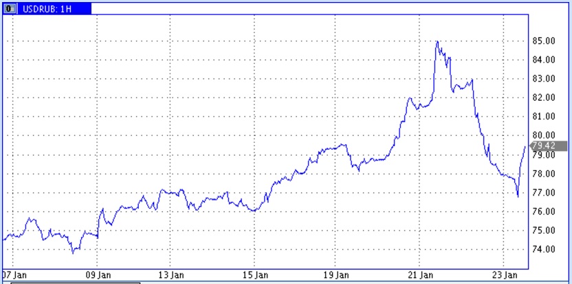 Но пока произошедший в конце прошлой недели отскок цен стал смотреться уж слишком оптимистичным. Тем более что все прежние медвежьи факторы пока еще очень свежи и остаются актуальными. Так что прыть нефтяных быков следовало немного охладить корректирующим снижением. Именно с такими настроениями стартовало открытие торгового дня в понедельник. Цены нефти откатили вниз на 2 доллара за баррель. На смену динамики нефтяных цен очень эмоционально отреагировал рубль. После утренних минимумов около 76,2 рублей доллар к средине дня поднялся почти на 3 рубля до 79,2 рублей за доллар.