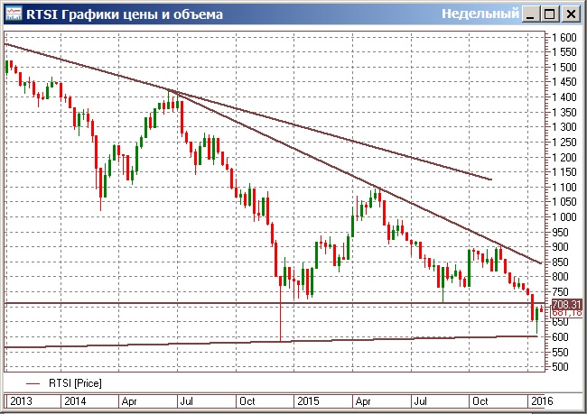 Прошлая неделя на рынках выдалась бурной и переменчивой. С начала недели продолжалось снижение цен на сырьевых и товарных рынках. Так, фондовый рынок США опустился до уровней минимумов 2015 года. Фондовый рынок Китая установил новые минимумы. Но наибольшее впечатление производили цены на нефть, которые опускались почти до 27 долларов за баррель. В таких условиях наш фондовый рынок тоже показывал приступ хандры. Индекс РТС опускался почти до 600 пунктов. Правда основная часть снижения индекса происходила за счет слабости рубля. Доллар долетел до 83, а евро до 93 рублей за единицу. Многие игроки на повышение понимали, что снижение на рынках стало слишком большим и наступает момент для покупок. (Как мы и предполагали в прошлом обзоре, уровни РТС вблизи 600 пунктов оказали рынку мощнейшую поддержку).