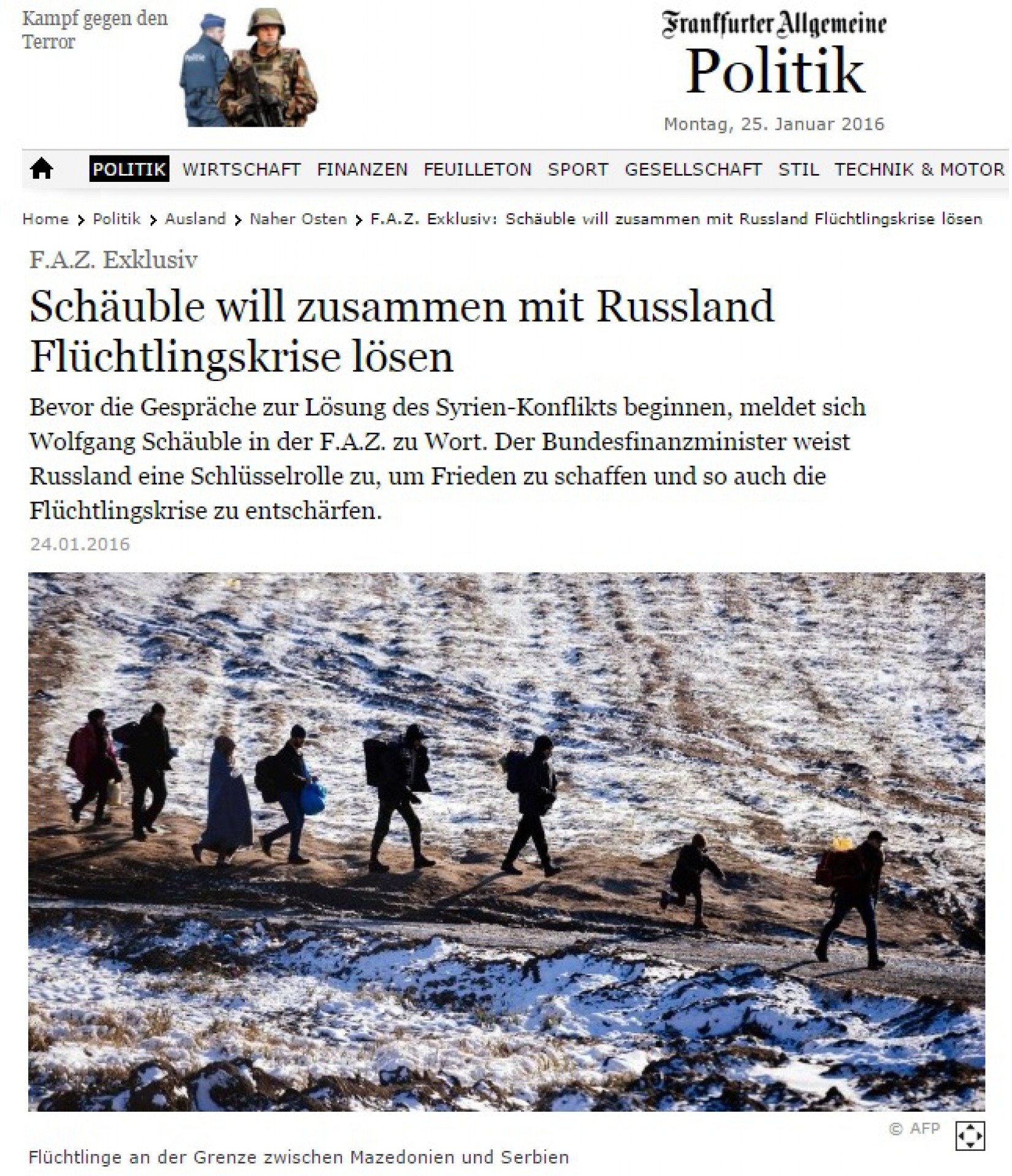 Министр финансов Германии Вольфганг Шойбле призвал страны ЕС активнее содействовать стабилизации ситуации на Ближнем Востоке, если они хотят решить проблему беженцев. При этом сотрудничество с Россией так или иначе является необходимым для Европы.