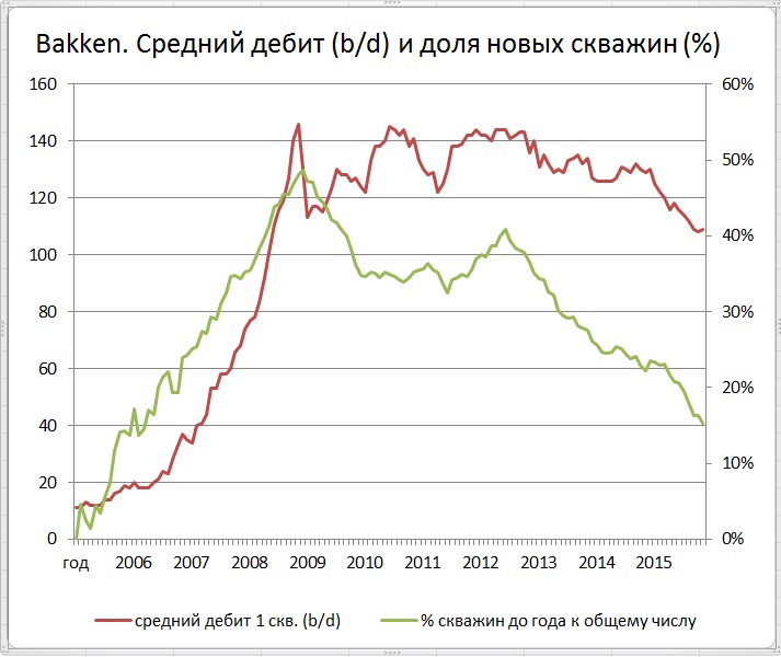 Тренды бурения и добычи достаточно неторопливы, но зато неумолимы. Это можно увидеть на данных месторождения Bakken, которое недавно было крупнейшим месторождением добычи сланцевой нефти в США. На начало декабря там работало 10314 добывающих нефтяных скважин, на которых добывается 1,12 млн. баррелей нефти в день. Наблюдающееся в последний год снижение интенсивности бурения постепенно делает там свое дело. Во всем огромном парке добывающих скважин падает доля скважин возрастом до одного года. Поскольку добыча нефти показывает довольно сильное снижение со временем, особенно после первого года эксплуатации скважины, то за счет снижения доли молодых скважин снижается средний дебит, приходящийся на одну скважину. И этот процесс проявляется все более отчетливо. На текущий момент средний дебит по всем скважинам опустился ниже 109 баррелей в день на одну скважину. Это самый важный процесс, который, в конце концов, будет приводить к снижению добычи и, как следствие, к началу более уверенного роста цен нефти.