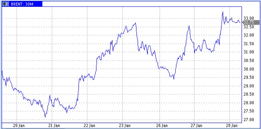 Цены на нефть по итогам дня вновь существенно подросли. По нефти марки Brent цена достигла 33,1 доллара за баррель. Против минимальных отметок цены подросли более, чем на 20%. Вчерашний рост цен в основном связывают с проводившемся в Минэнерго совещании руководителей нефтегазового сектора. Как сказано в сообщении министерства: «участники совещания обсудили возможность координации действий со странами ОПЕК в связи с неблагоприятной ценовой конъюнктурой на мировом нефтяном рынке». Это пока просто обсуждение. Однако участники встречи говорили, что со странами ОПЕК уже ведутся переговоры на эту тему и встреча, посвященная этим вопросам, может состояться уже в феврале. Не известно удастся ли договориться о чем-то на такой встрече, но сам факт ее возможного проведения оказывает благоприятное воздействие на нефтяные цены.