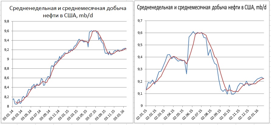 Согласно недельным оценкам среднедневные объемы добычи за неделю, закончившуюся 22 января, снизились на 14 тыс. бар. в сутки (до 9,221 с 9,235 mb/d неделей ранее). Это на 125 тыс. баррелей в сутки (+1,4%) выше, чем в минимуме полугодия от 16 октября и на 389 тыс. (-4,0%) баррелей в сутки меньше, чем в максимумах от 5 июня 2015 года.