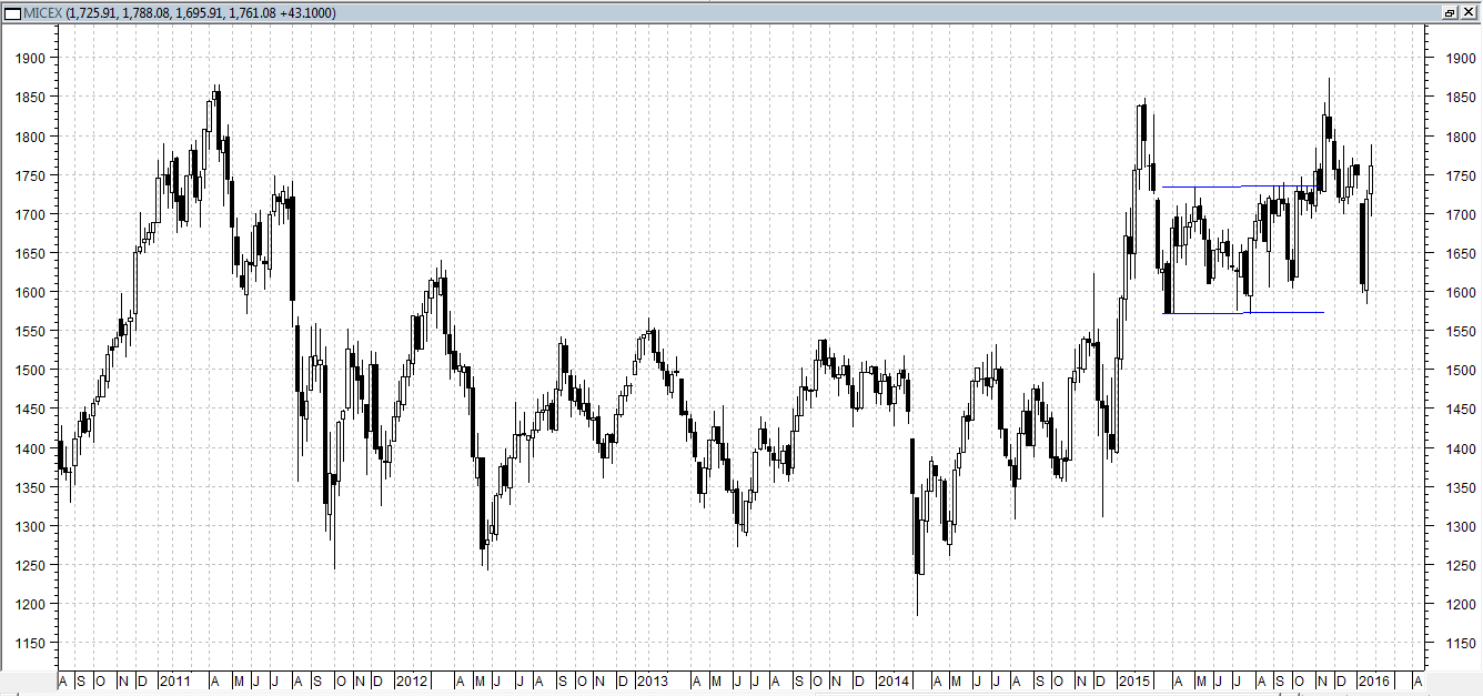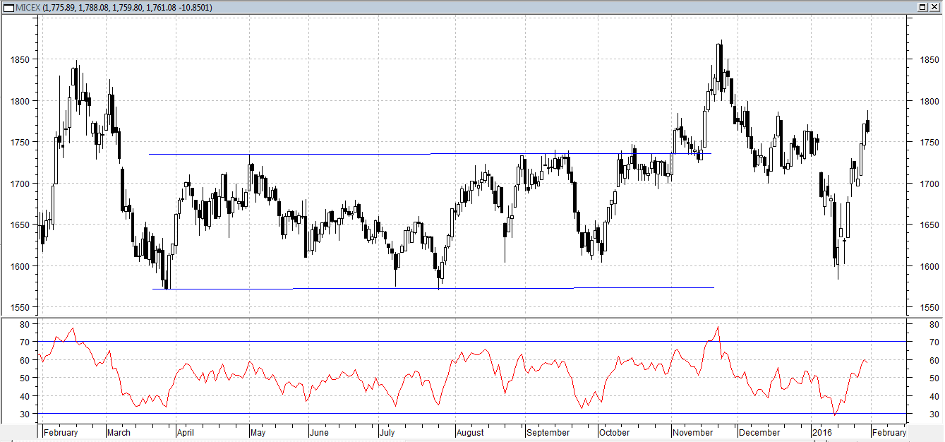 В последние дни индекс ММВБ хорошо подрос, на фоне отскока нефти. Вместе с тем, индекс ММВБ приблизился к сильному уровню сопротивления 1770-1780 пунктов. На данном уровне стоит ожидать консолидации или коррекции вниз. Технический индикатор RSI пока находится в нейтральном положении и не дает четких сигналов. Тем не менее, после двухнедельного роста, положение индекса ММВБ существенно улучшилось. В ближайшие дни ожидаем корректирующего движения индекса ММВБ, после завершения, можно ожидать продолжение роста к отметке 1870 пунктов.