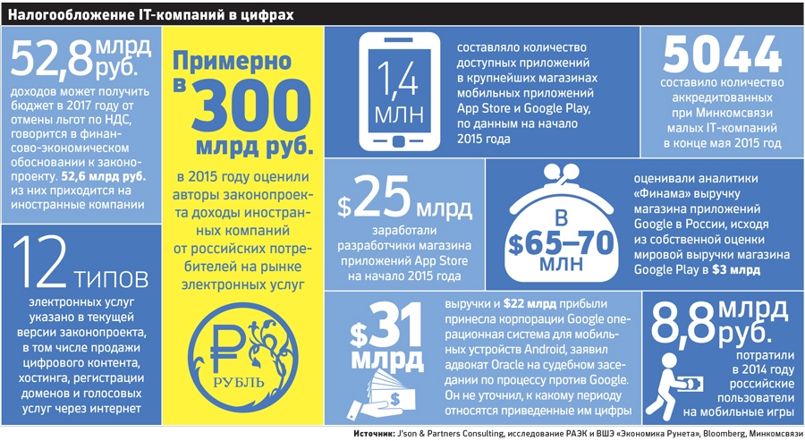 Новый законопроект «по данным статистической налоговой отчетности 2015 года и экспертным оценкам» приведет в 2017 году к росту доходов бюджета на сумму 52,8 млрд руб., говорится в финансово-экономическом обосновании к законопроекту. Большую часть этой суммы — 52,6 млрд руб. — принесет отмена льгот по НДС для иностранных компаний, уверены депутаты. Оставшиеся 200 млн руб. в бюджет должны принести российские компании, следует из документа. Ущерб для отрасли может составить «десятки миллиардов рублей в год», оценивали представители компаний.