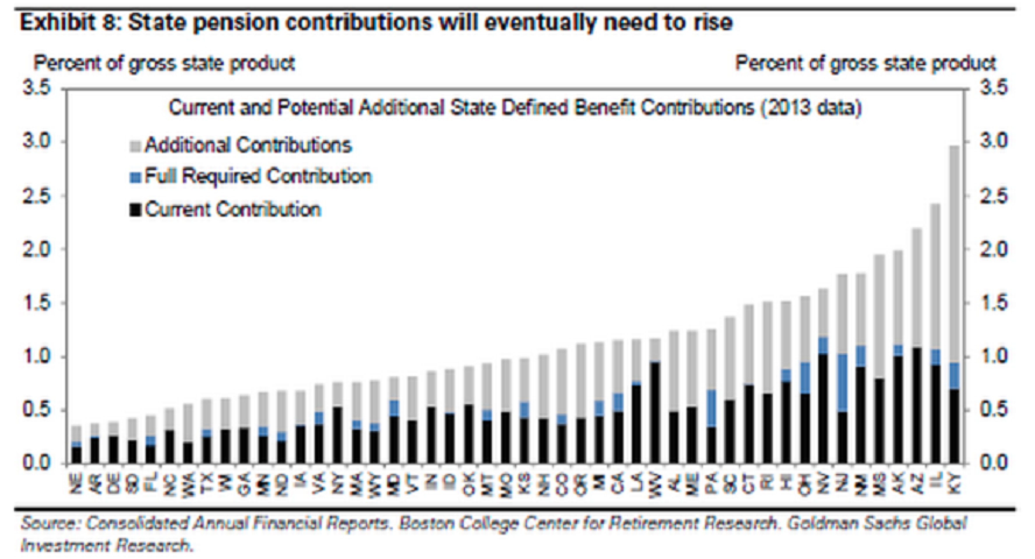 Об этом говорят и в Goldman. Пенсионные взносы сейчас ниже, чем необходимо для стабилизации или снижения необеспеченных обязательств. Кроме проблем со взносами по пенсионными планам, в некоторых случаях сами штаты нарушают правила, даже не финансируя свои фонды на минимальные суммы. Так, например, в течение последних нескольких лет Нью-Джерси в среднем вносил лишь около 40% ожидаемых сумм.