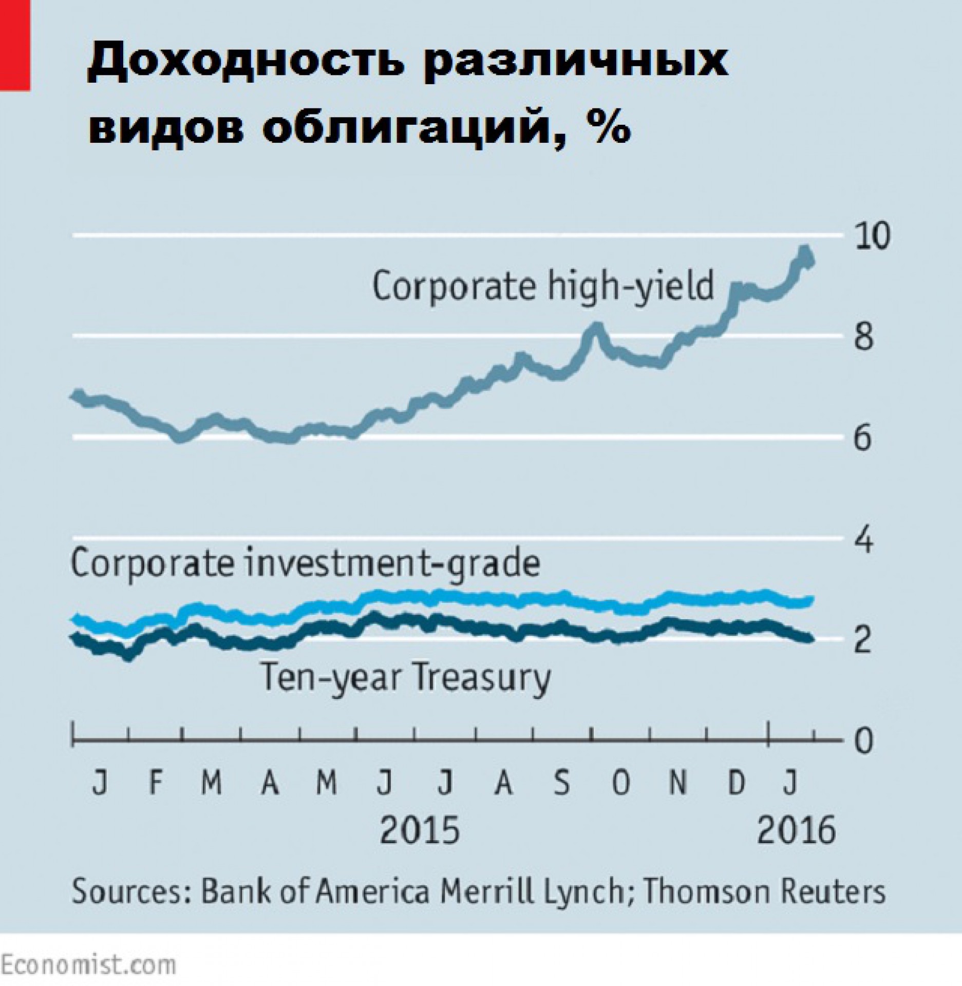 Согласно данным Bank of America Merrill Lynch (BAML) европейские корпоративные облигации на сумму примерно в 65 млрд евро ($71 млрд) торгуются с отрицательной доходностью; другими словами, инвесторы, имеющие эти бумаги, теряют деньги. При этом ставки, по которым эмитенты низкокачественных, или "мусорных", облигаций выплачивают проценты, стремительно растут вверх.