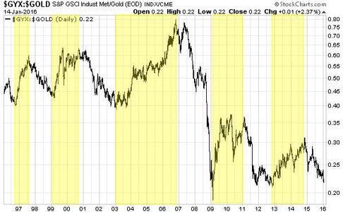 Я считаю показатель золото/GYX (цена золота относительно корзины промышленных металлов) определяющим показателем бума и спада. Цена золота неизменно снижается относительно цен промышленных металлов во время периодов подъёма и растёт в последующие периоды спада. Неудивительно, с учётом экономической реальности, что относительное поведение золота и промышленных металлов может служить столь же превосходным показателем общих (социальных) временных предпочтений.
