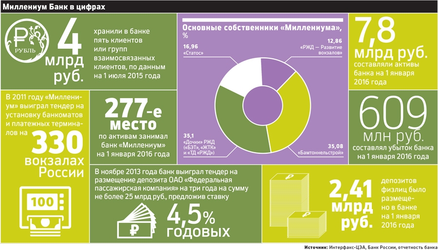 К 2013 году, когда «Бамтоннельстрой» уступил 35,1% акций банка трем дочерним компаниям РЖД за 300 млн руб., «Миллениум» был в куда более привлекательном финансовом состоянии, чем теперь. По данным рейтинга «Интерфакса», размер его активов составлял в 2013 году 11,29 млрд руб., капитал был равен 765 млн руб. Впоследствии капитал увеличился до 1,1 млрд руб., но объем активов стабильно сокращался и к концу 2015 года достиг 7,836 млрд руб.