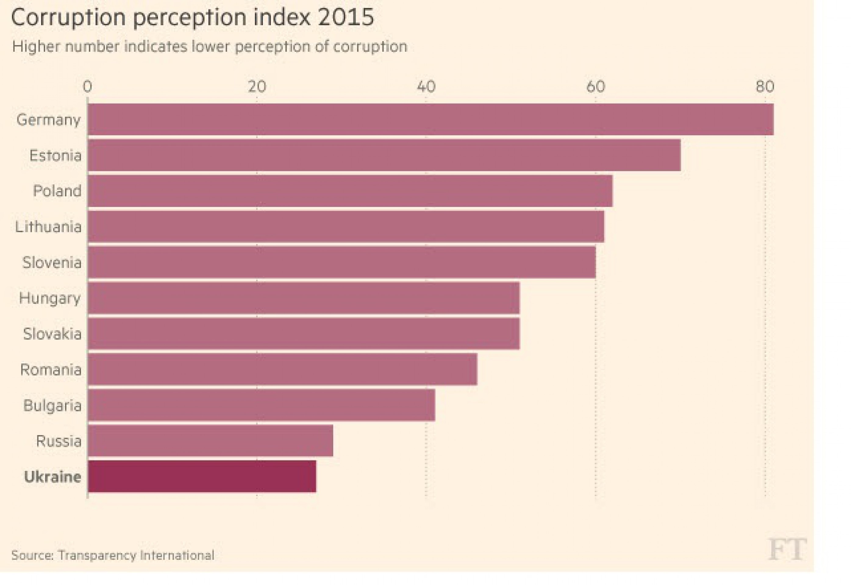 Кстати, согласно индексу коррупции, приведенному FT, Украина занимает едва ли не лидирующее место (меньшее значение индекса указывает на более высокий уровень коррупции).