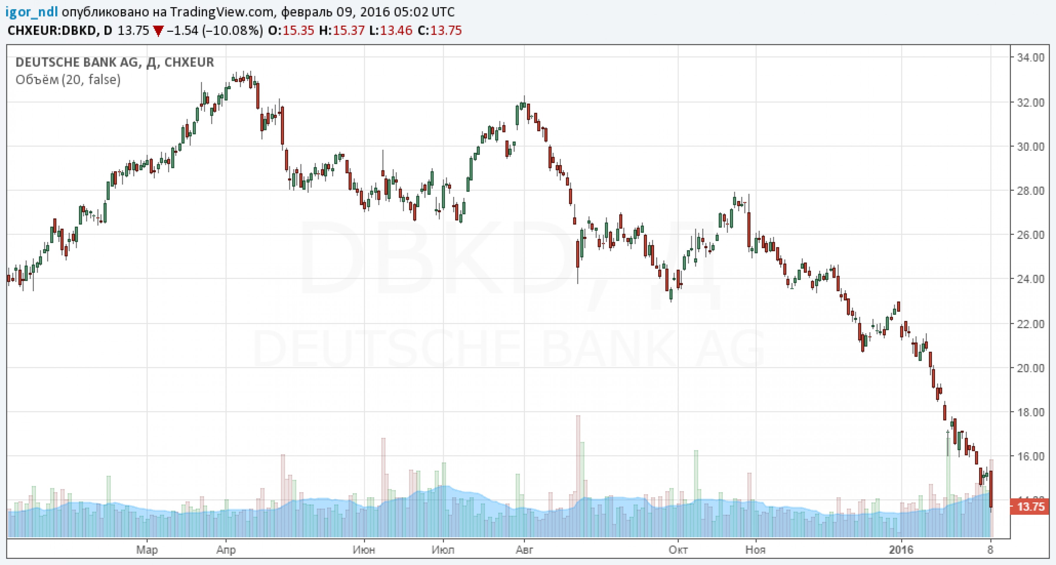 Именно Deutsche Bank сейчас в центре внимания инвесторов и спекулянтов. Только в понедельник его капитализация рухнула на 10%, а в целом котировки обновили многолетние минимумы.