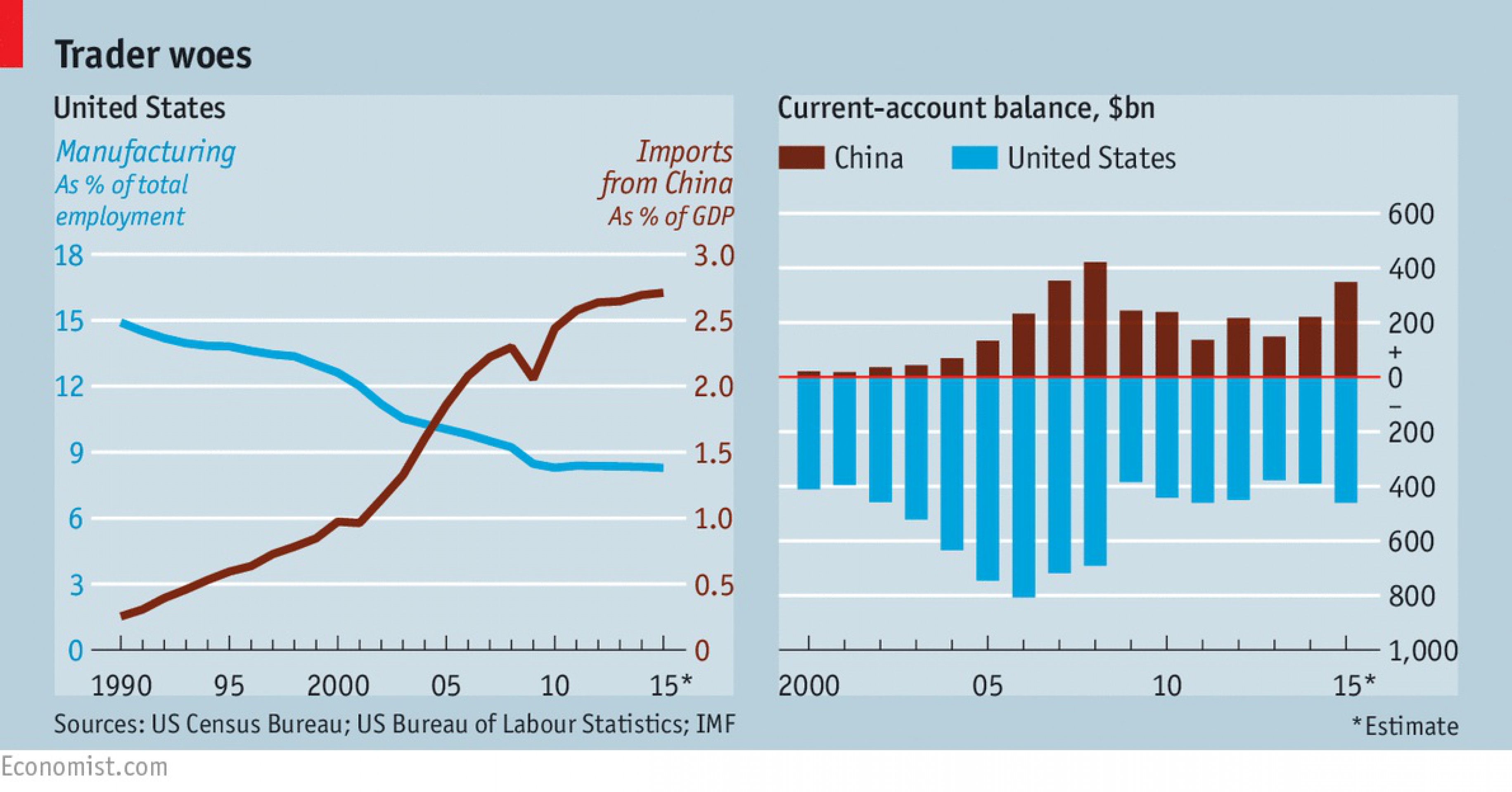 Американцы же, по мнению исследователей, особенно в индустриальных центрах страны (как, например на Среднем Западе), оказались в явном проигрыше. Ученые обнаружили, что конкуренция с китайским импортом объясняет 44% снижения занятости в промышленности Америки в период между 1990 и 2007 гг. Кроме того, для любого сектора увеличение китайского импорта на $1 тыс. на одного рабочего в год ведет к общему снижению годового дохода в размере $500 на одного рабочего.