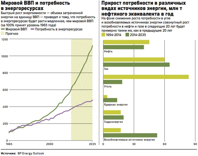 Согласно прогнозу BP, который в Лондоне представили глава компании Роберт Дадли и главный экономист Спенсер Дейл, в период с 2014 по 2035 год мировой спрос на энергоресурсы вырастет на 34% (в среднем — на 1,4% ежегодно). Основу прироста спроса (порядка 60%) обеспечат нефть и газ. К 2035 году на них будет приходиться почти 80% всех поставок энергоносителей.