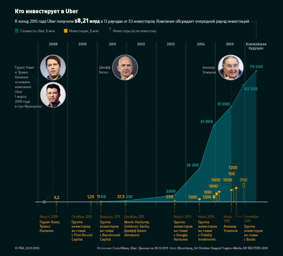 В январе этого года РБК выяснил, что инвестором Uber также является холдинг USM Алишера Усманова. Источник, близкий к USM, тогда рассказывал, что холдинг участвовал в очередном раунде финансирования американского стартапа летом 2015 года и вложил «несколько десятков миллионов долларов». На тот момент оценка всей компании составляла $51 млрд, уточнял он. В декабре 2015 года инвесторы оценили Uber уже в $62,5 млрд. Сервис, который работает в 400 городах мира в 68 странах, возглавляет топ самых дорогих стартапов мира.